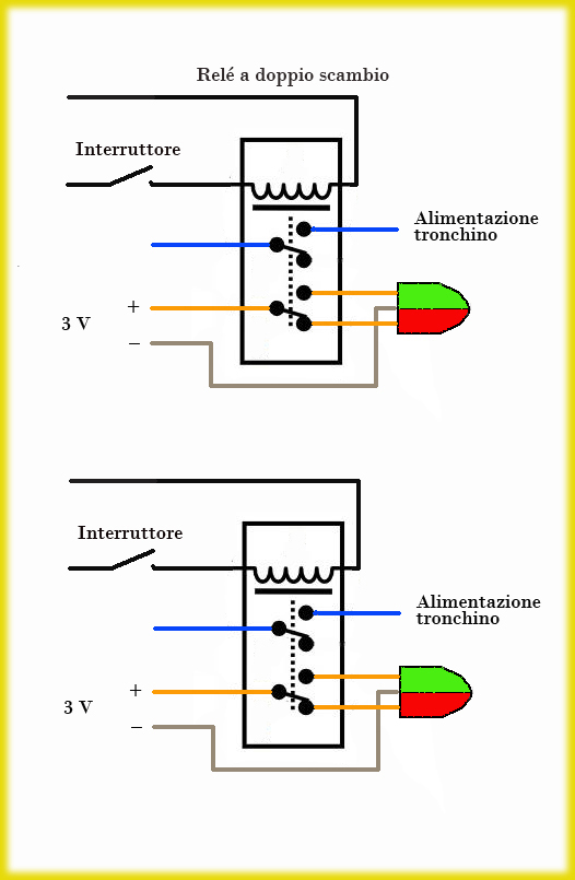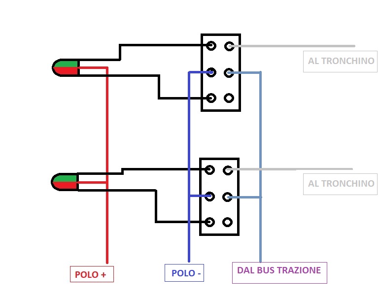 Nel mio esempio ho dato alimentazione al tronchino in alto (led verde) e non ai due in basso (led rossi).