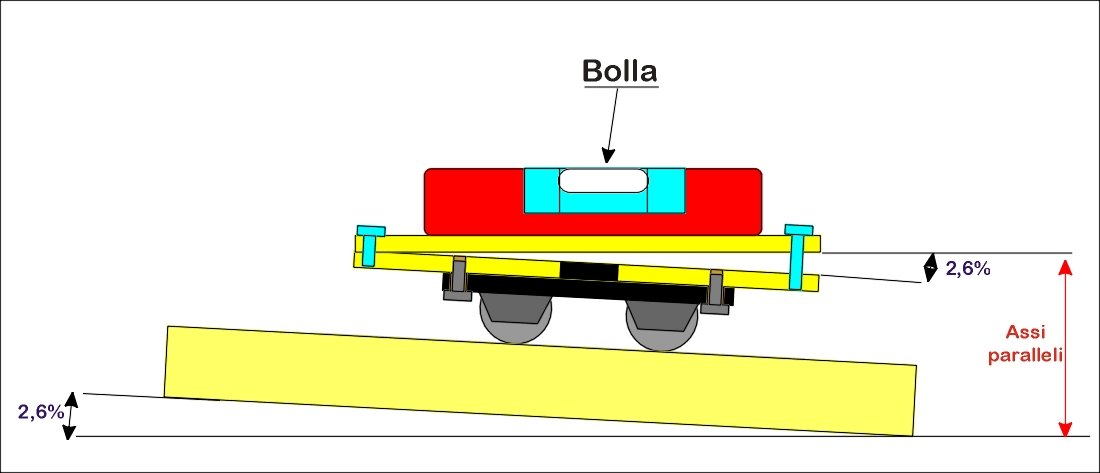Ho messo la bolla lunga inclinata al 2,6%, inserendovi sotto, da un lato, uno spessore di 11 mm (pari al 2,62% della pendenza su 420 mm).