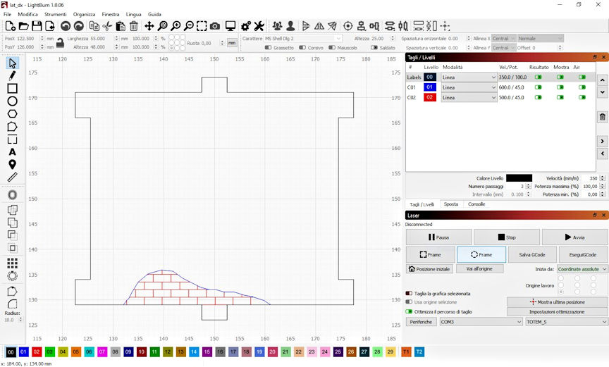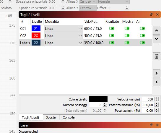 il software in dotazione è LaserGRBL che è free, però fa una operazione alla volta o taglio o incisione, io sto usando LightBurn che è a pagamento (non è una spesa eccessiva) nel quale puoi impostare più operazioni insieme dividendole per coloriin alto sulla destra puoi vedere i tre colori separati il nero per il taglio e gli altri due per l'ncisioneognuno lo puoi settare a piacere, come vedi sulla dx ci sono i parametri in evidenza velocità (da 100 a 1000mm/sec) e potenza del taglio (in %) che devi settare sotto, a dx della finestra di lavorazione ci sono delle freccette con quelle puoi ordinare la priorità di lavorazione, io ho scelto il taglio(nero) per ultimo così da non avere problemi di movimento del pezzo se è già tagliato.