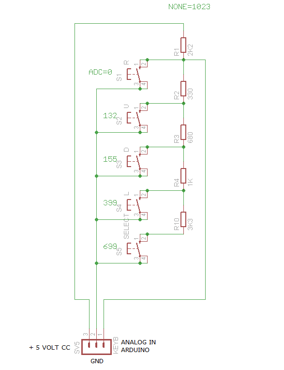 Qui sotto uno schema elettrico con 5 pulsanti di un partitore resistivo di esempio da collegare ad una porta analogica di Arduino: