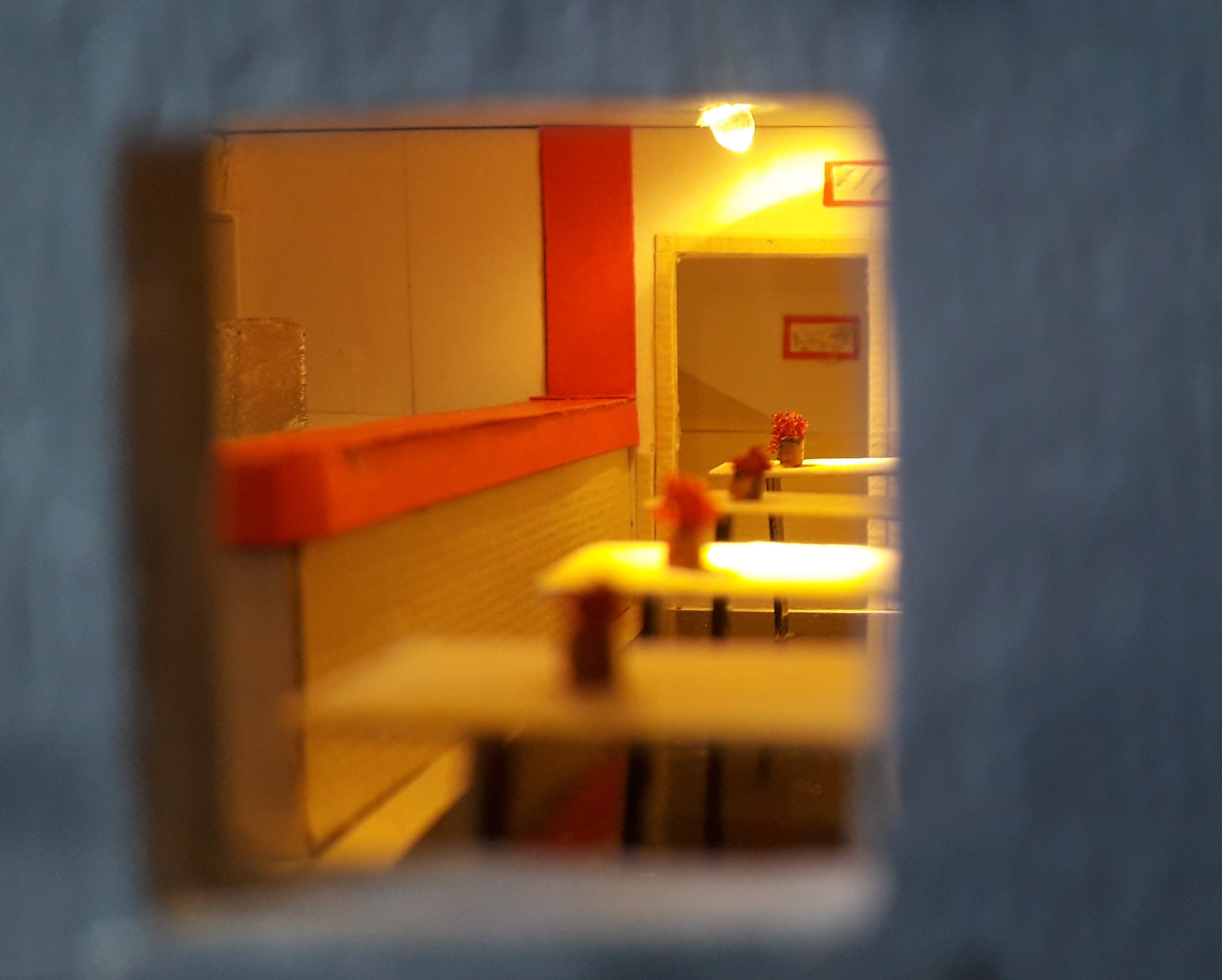 Ecco l'interno del Bar-Buffet. Mancano le sedie (che vorrei trovare fatte), qualche bottiglia sui ripiani e i vasetti di fiori sui tavoli. Idee su come realizzare queste minuzie? L'ambiente mi è rimasto un po' troppo stretto, ma degli interni non avevo preso le misure, sono andato a occhio.