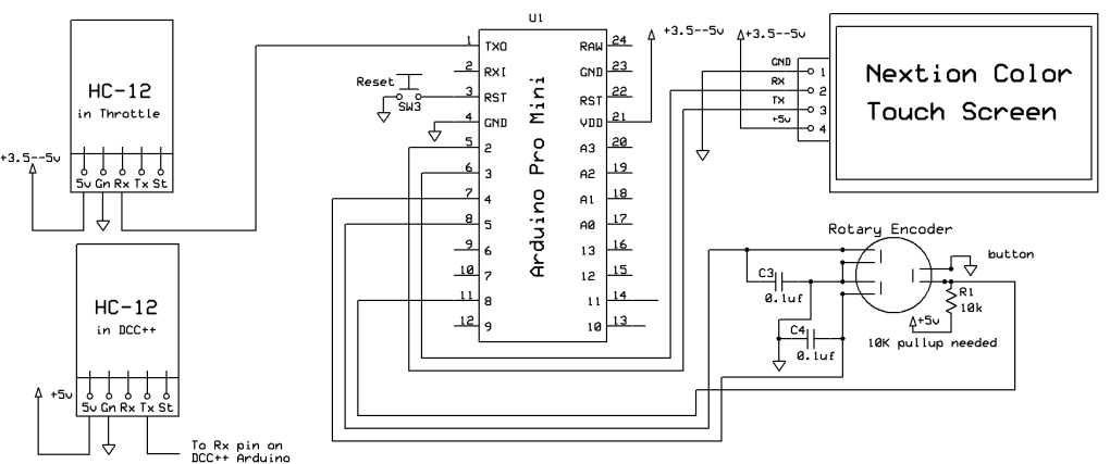 Una ulteriore scheda Hc12 va installata sulla centrale DCC++, collegata al pin TX dell’Arduino Uno secondo questo schema: Lo sketch per Arduino Uno ed il firmware per il Nextion sono in allegato.