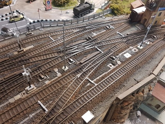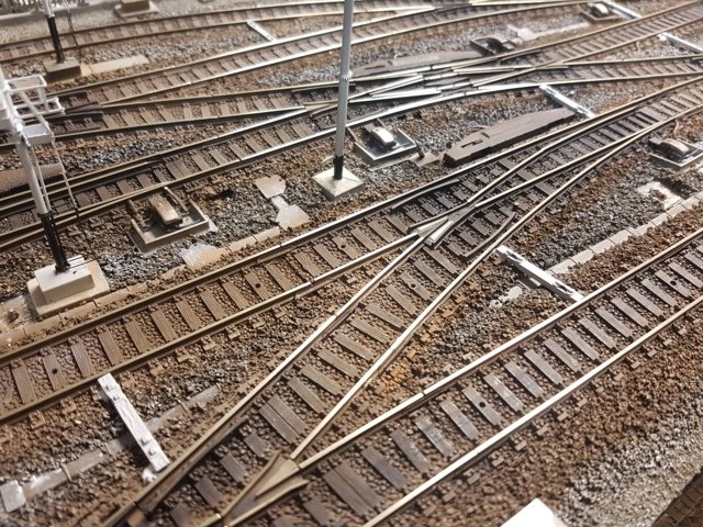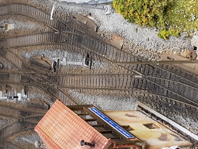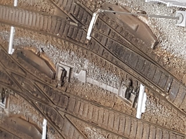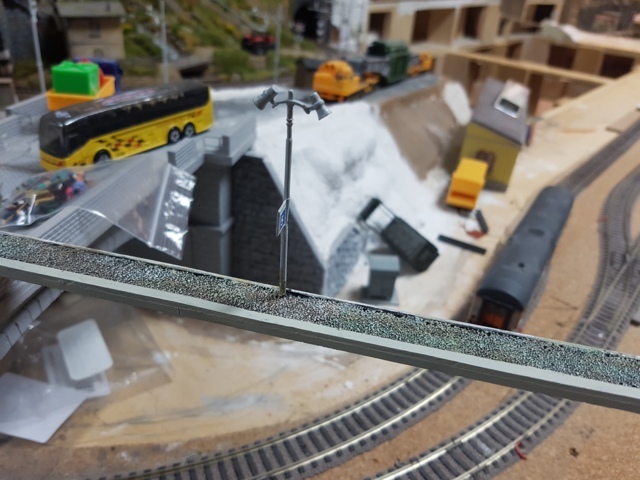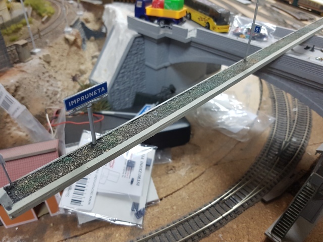 Iniziato il lumeggiamento della massicciata ed il posizionamento di una certa parte di particolari. Domani se riesco dovrei riuscire a collegare i 4 semafori ancora da collegare ai decoders e le 4 marmotte, con i rispettivi decoders, nella zona scalo containers.