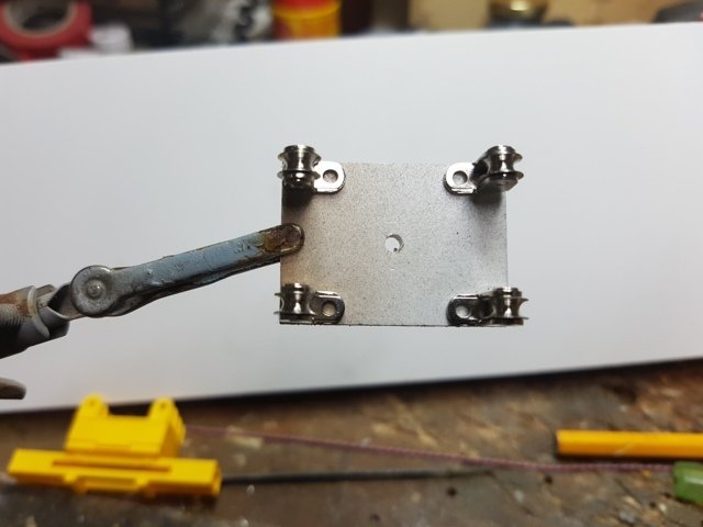 I due carrelli motore ed i due carrelli folli sono stati inseriti in due profilati in alluminio nei quali sono state realizzate delle scanalature realizzate allo scopo. Le prove di circolazione hanno dato buoni risultati. Da migliorare la captazione della tensione ma problema ritengo facilmente risolvibile una volta sistemato definitivamente il binario nella sua sede definitiva. Movimento del ponte caricatore: un motore a 12 V con riduttori di moto reperito via E-bay negli Stati Uniti ad un prezzo irrisorio, a cui è stata calettata una puleggia in teflon. La prima cosa è stata quella di realixzzare il supporto del motore. Quello che si vede in foto va rifinito con balaustra e simulerà un terrazzino per la manutenzione del motore. Ma il primo grosso problema è stato quello dello slittamento del filo di trasmissione sulle due pulegge in teflon. Dopo vari tentativi il problema è stato superato con un metodo semplice ma efficace, almeno sembra. Nella foto guida sarò più preciso. Carrello caricatore: quello in dotazione alla scatgola di montaggio ha subito profonde modifiche. I rulli in plastica sono stati sostituiti con micro cuscinetti a sfera (per avere uno scorrimento il più ottimale possibile vista la ridotta potenza del motorino) calettati su profilato cilindrico in rame saldato a sua volta su una lastrina in ottone. Le 4 lastrine di ottone sono isolate tra di loro e permettono l'alimentazione di motori in maniera pulita e senza fili in mezzo alle superfici di scorrimento. A Tutto ciò va agganciato il cuore dell'impanto di movimentazione dei containers. In questo caso il complesso è stato completamente rifatto utilizzando solo le gli ingranaggi per il sollevamento/abbassamento del ragno di aggancio containers.
