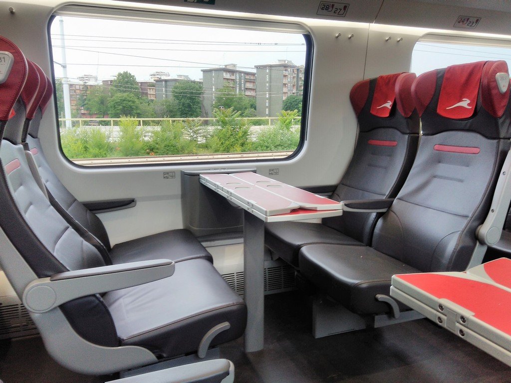 Circa 10 minuti prima della partenza il treno viene aperto, quindi salgo a bordo e prendo posto nella vettura 4, ambiente Smart. Il treno si presenta in perfette condizioni di ordine e pulizia, a bordo sono disponibili distributori automatici di bevande, connessione wifi gratuita, prese elettriche ai posti, monitor informativi e annunci audio relativi a itinerario e prossime fermate. L'ambiente è abbastanza luminoso, dominato dai colori grigio e rosso, i sedili sono comodi e rivestiti in pelle, mentre lo spazio per i bagagli non è molto abbondante. E' possibile stipare i bagagli nelle rastrelliere al di sopra dei sedili oppure in appositi spazi situati nei vestiboli o in prossimità degli stessi. Su alcune vetture l'altezza del soffitto variabile limita la capienza delle rastrelliere al di sopra dei sedili, fatto dovuto alla presenza dei pantografi per la tensione di 25 kV sul tetto.