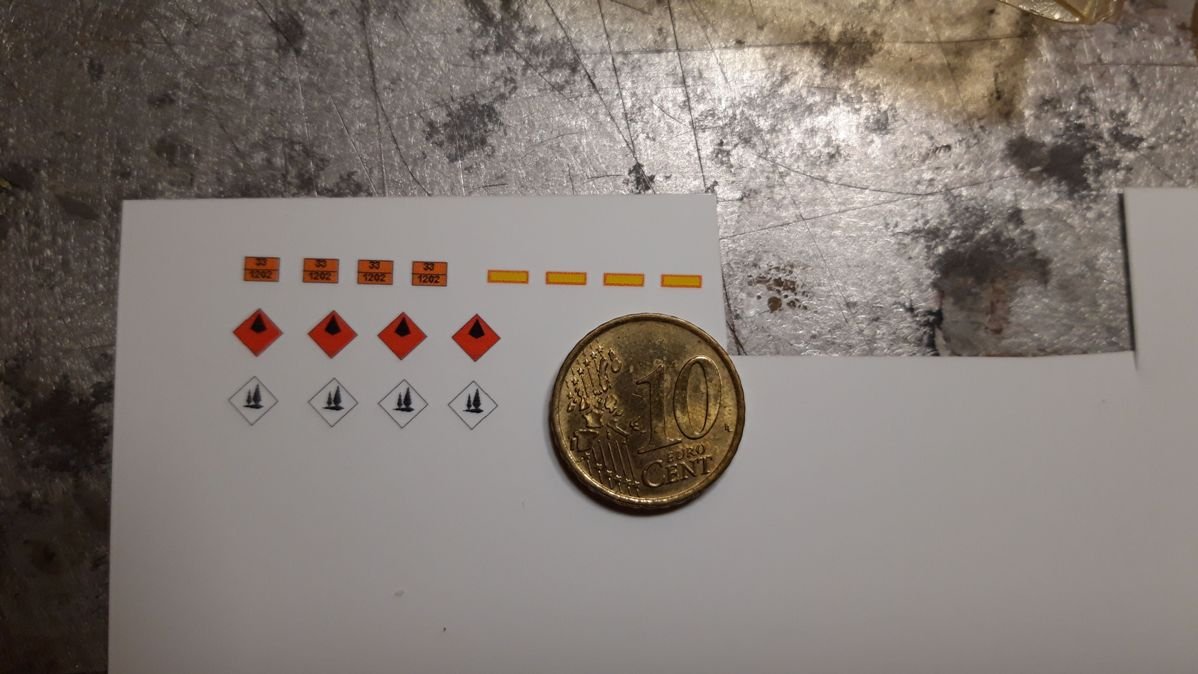 L'autocisterna trasporta gasolio, quindi il codice Kemler impone "33 - 1202" - infiammabile - inquinante. Anch a lato sono presenti le tabelle di pericolo Inoltre ho rifatto i cartelli di "direzione obbligatoria" staccatisi nel tempo...