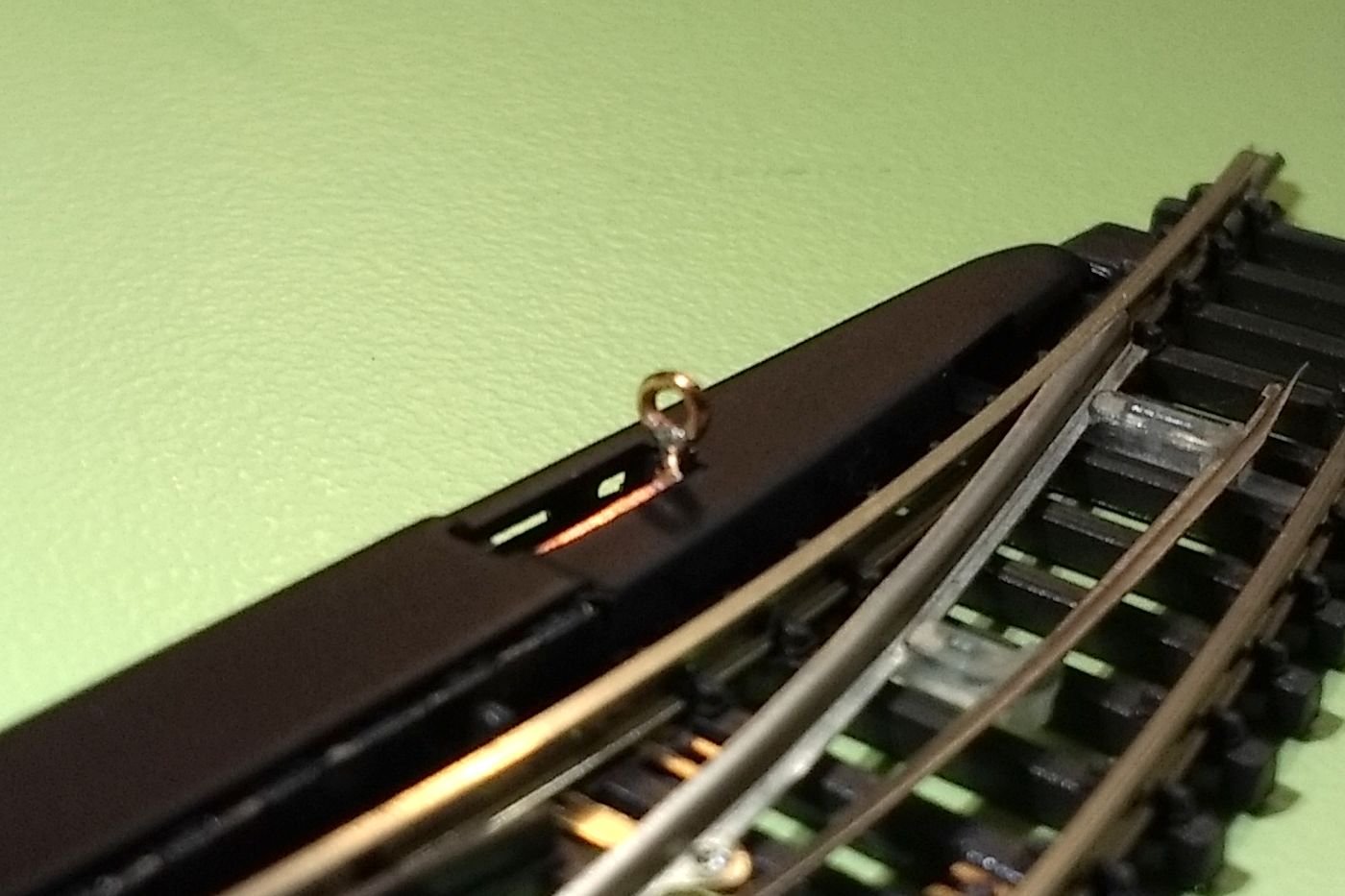 Facendola girare nel circuito Zen ho avuto un problema: nel passare il deviatoio curvo su cui avevo saldato un anellino per il comando a distanza, c'era un'interferenza con la fiancata. Ho quindi fatto una modifica, come potete vedere dalle foto qui sotto.