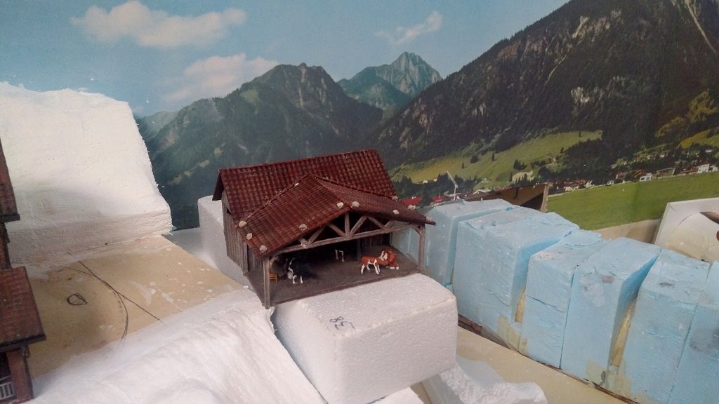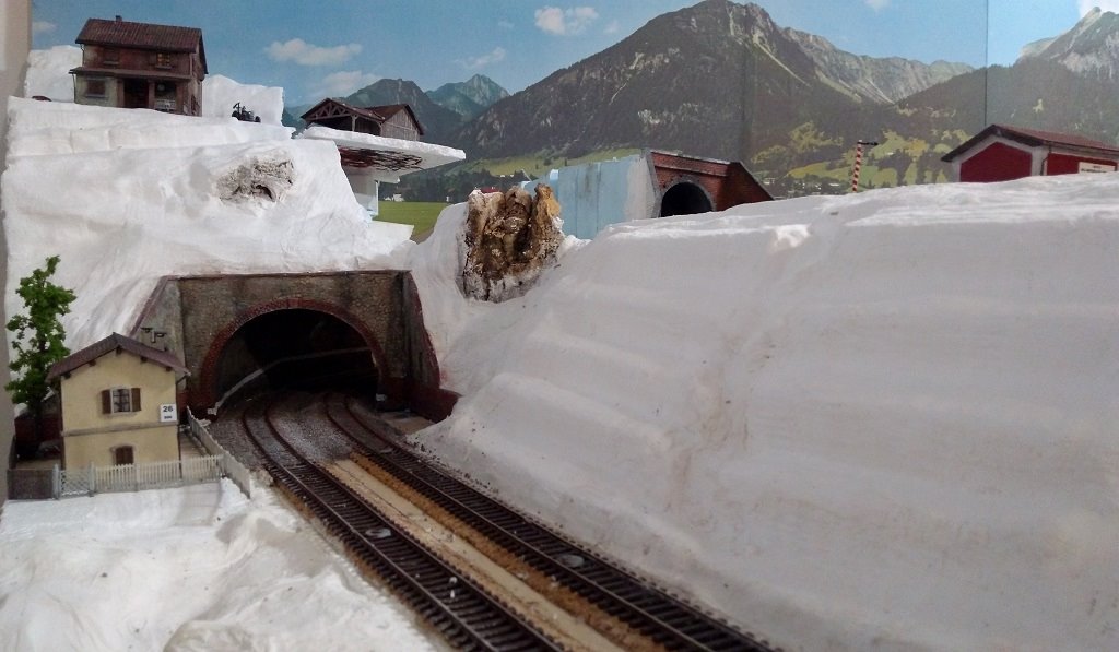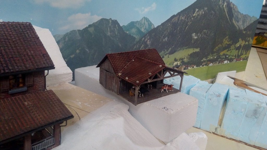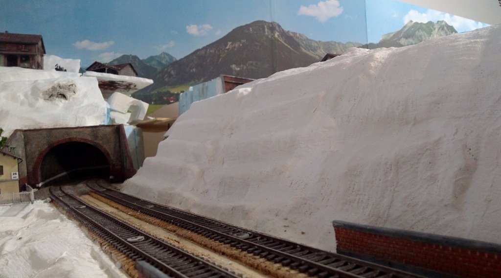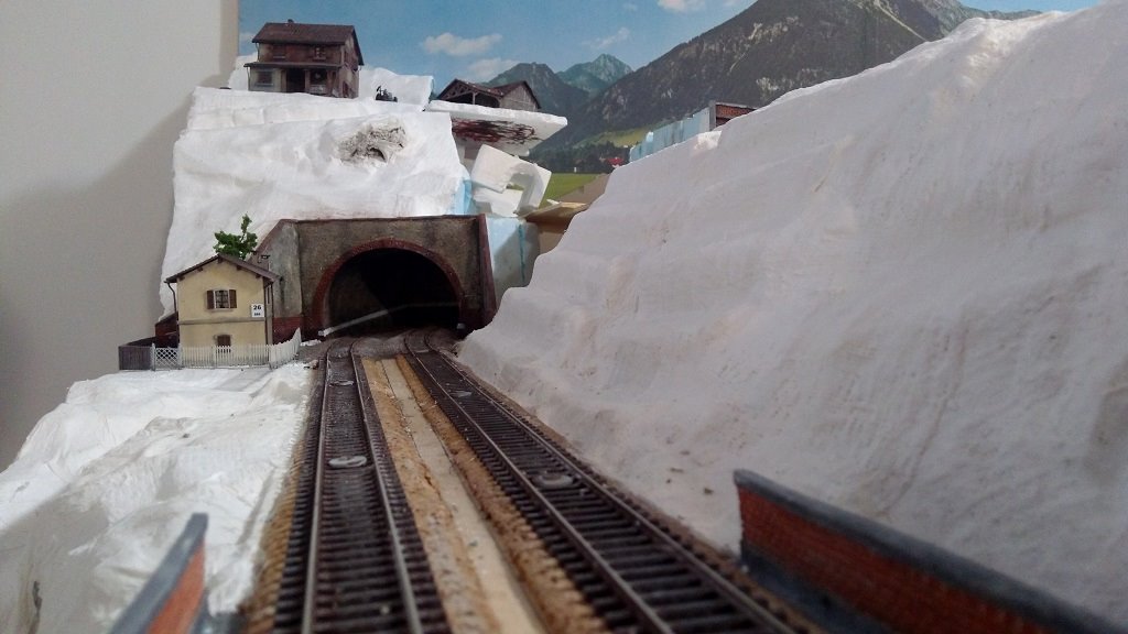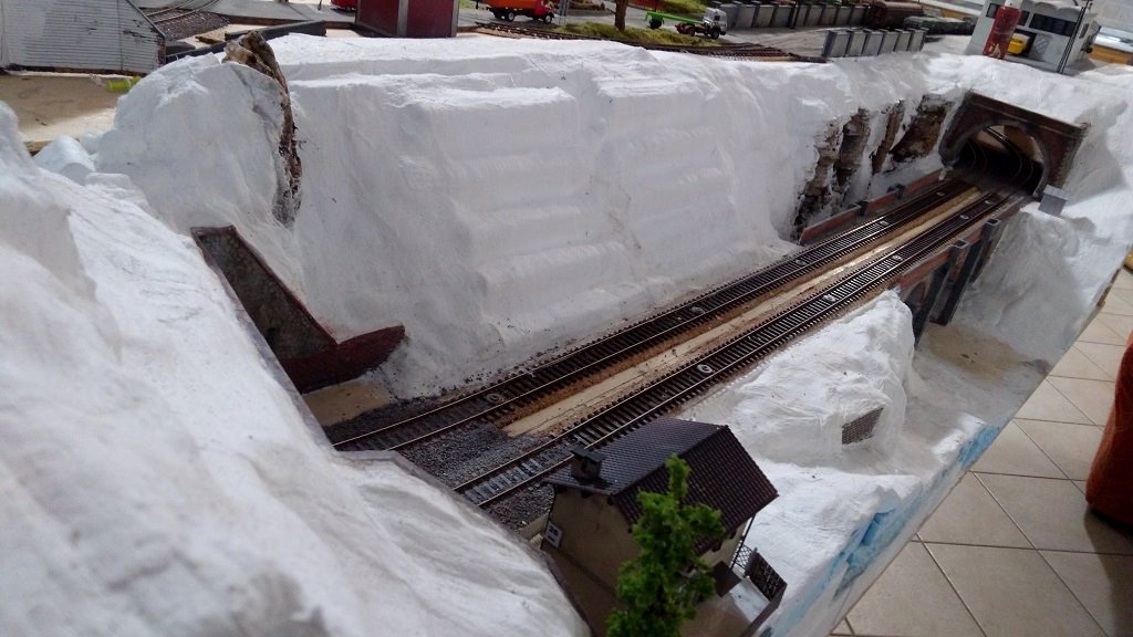 Devo ancora terminare l'ultima parte verso destra sopra il portale stradale, ho inserito in alcuni punti delle rocce fatti con la corteccia di sughero per variare un po' la scenografia e rendere il tutto meno piatto, l'idea di base per la parte di fondo sulla sinistra è il casale che domina l'area con accanto la stalla con il bestiame e relativo recinto, seguirà poi una parte boschiva che farà da cornice sul retro del casale e da filtro sulla destra sopra i due portali, ferroviario e stradale con l'eventuale scena successiva, devo vedere se fare qualche aggiustatura al terreno ma l'ultima parte sulla destra non è ancora completamente asciutta, nel complesso non mi sembra male :wink: