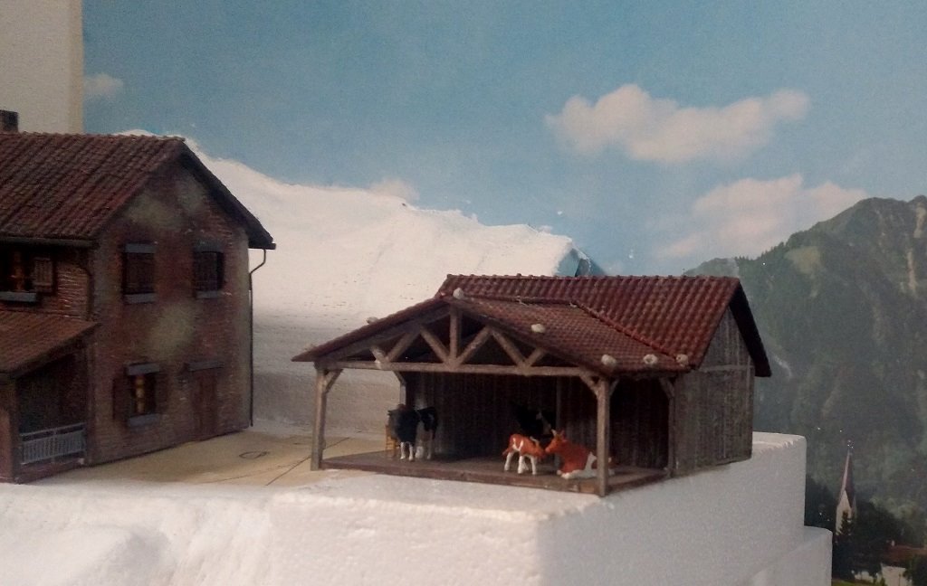 Ho terminato la scena inserendo alcuni animali(gli altri verranno collocati nel recinto) con la vecchina di casa che sta mungendo la mucca :)