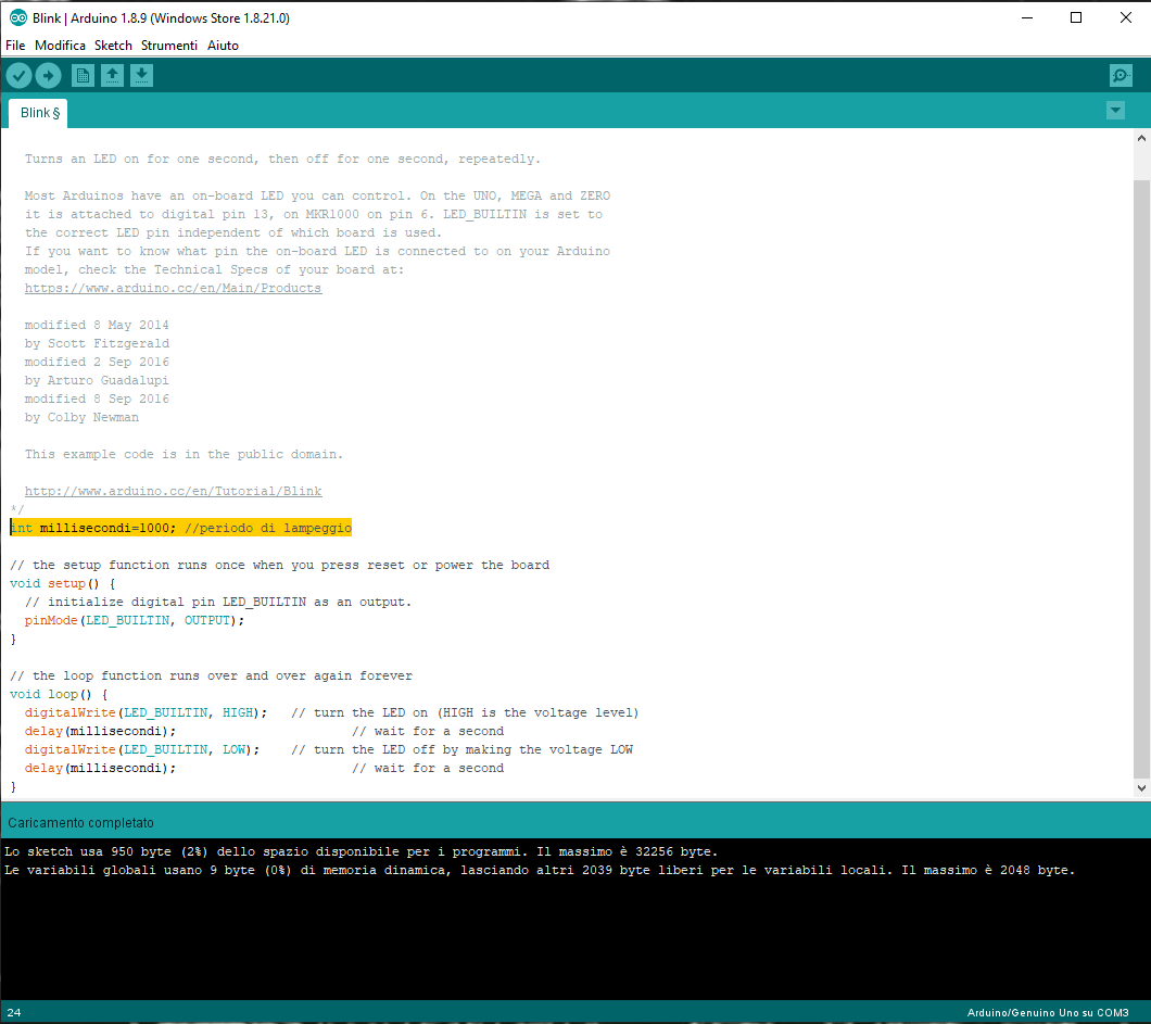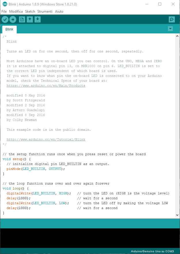 Ora apriamo l’IDE e carichiamo il programma dimostrativo “Blink”; lo trovate in “File/Esempi/01.Basics”.