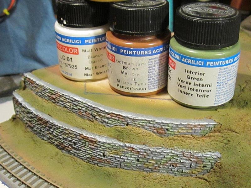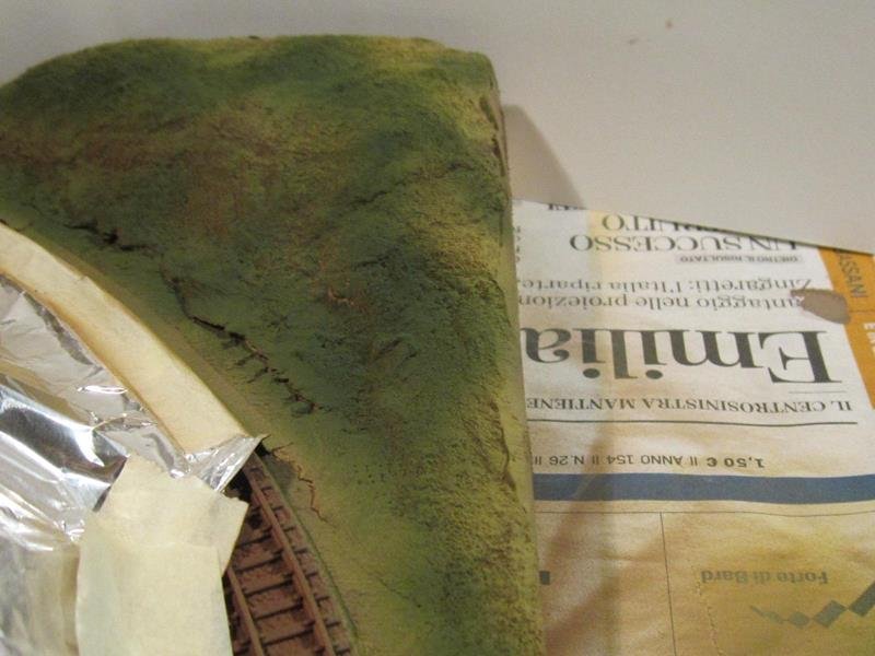 dopo un veloce passaggio di aerografo sulle rotaie con colore Tamiya XF - 68 rosso ruggine scuro per il fondo ho iniziato ad abbozzare la collinetta sul lato esterno fronte muraglioni.