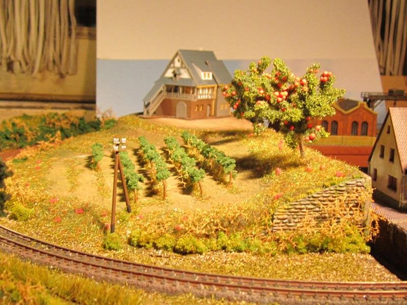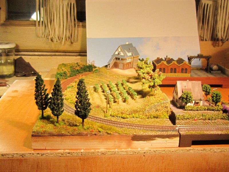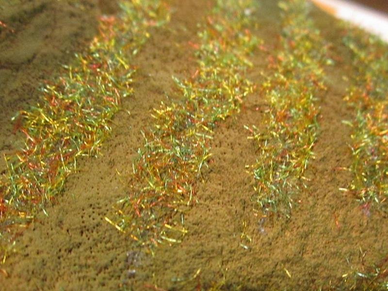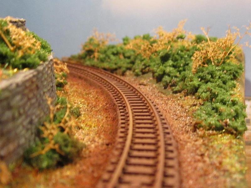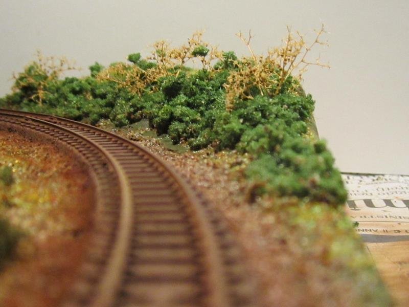 Bene proseguono i lavori, posato erba, cespugli, ballast è una mano di color ruggine sul ballast attorno alla linea.