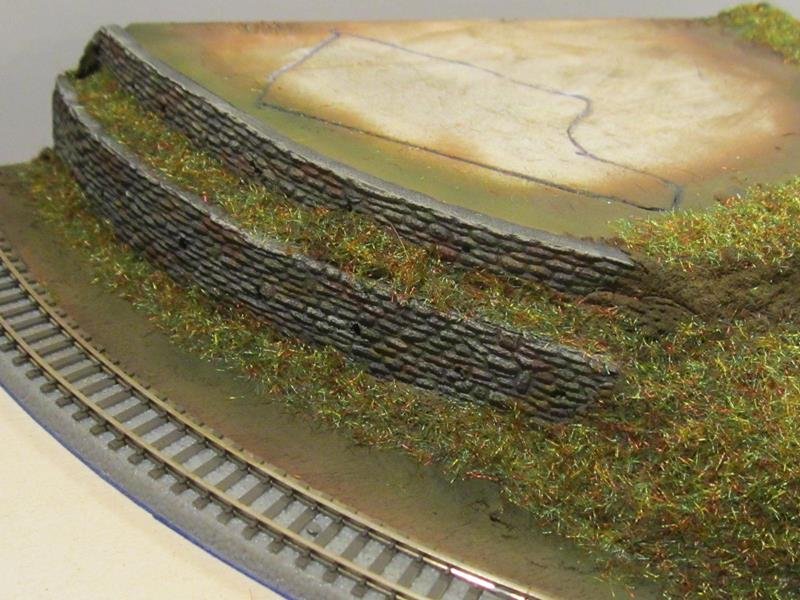 dopo un veloce passaggio di aerografo sulle rotaie con colore Tamiya XF - 68 rosso ruggine scuro per il fondo ho iniziato ad abbozzare la collinetta sul lato esterno fronte muraglioni.