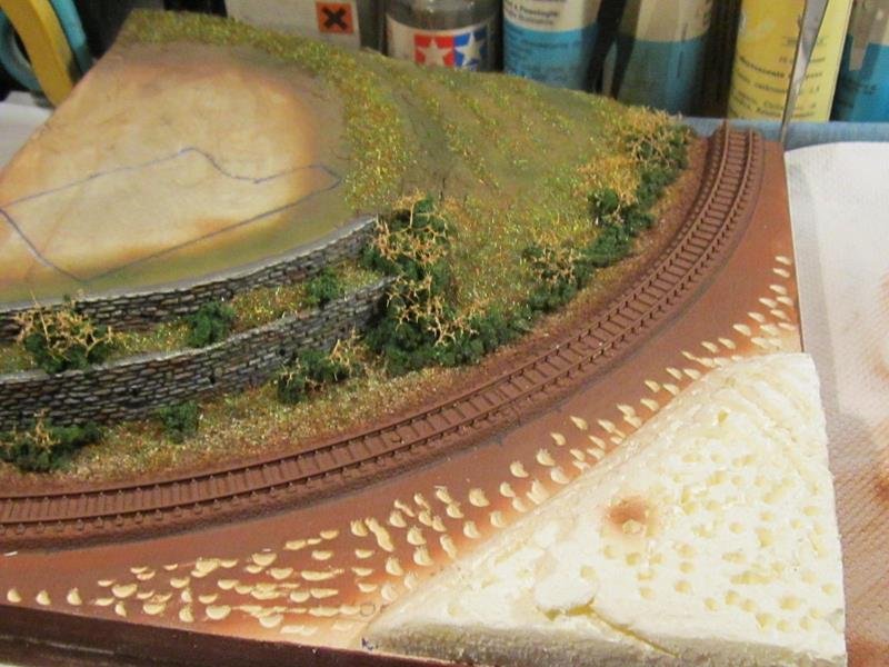 dopo un veloce passaggio di aerografo sulle rotaie con colore Tamiya XF - 68 rosso ruggine scuro per il fondo ho iniziato ad abbozzare la collinetta sul lato esterno fronte muraglioni.