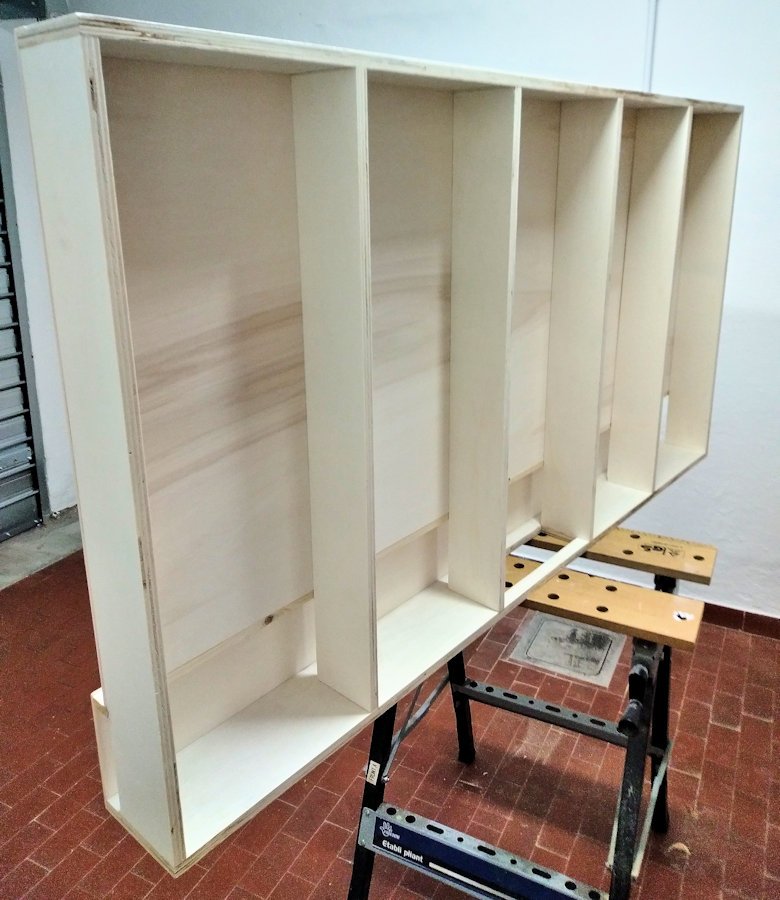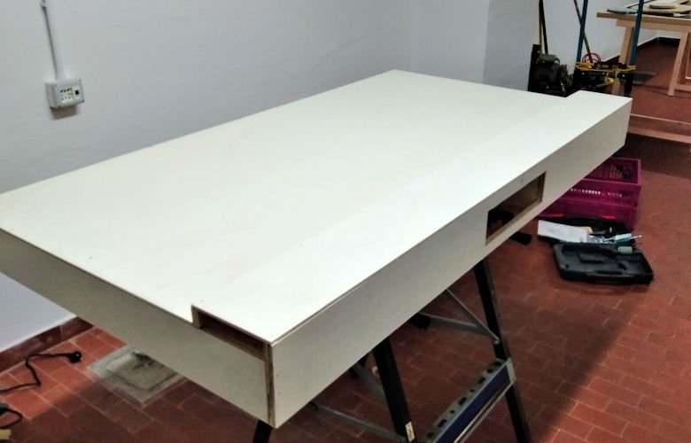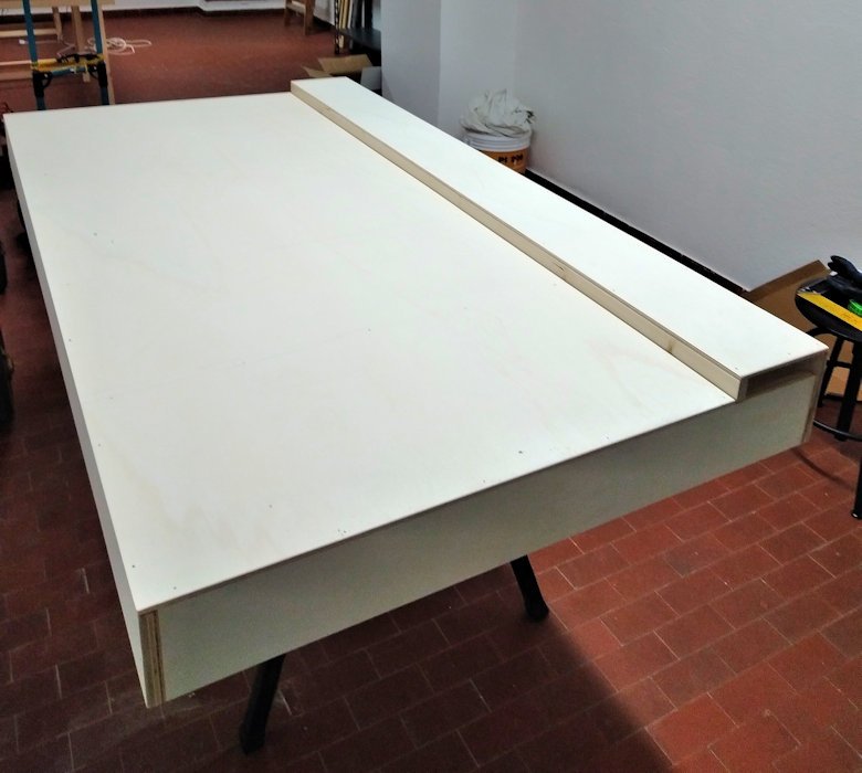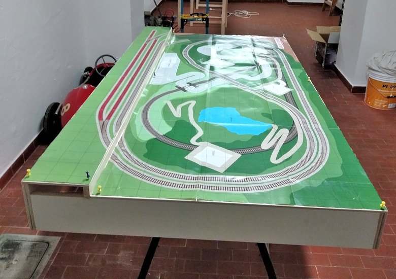 è fatta in unico blocco col rilievo dei 3cm nella parte stazione in legno e predisposto un vano per l'alloggiamento di un cassetto sul fianco dove inserire il quadro sinotico e tutti gli accessori per il funzionamento, come materiale ho usato spessore di15mm per il telaio e 6mm per il piano base, rispetto al disegno ho solamente modificato l'altezza del telaio facendola di 10cm, ho mantenuto il tracciato originale non essendo più disponibile materiale in arretrato da parte della DeA