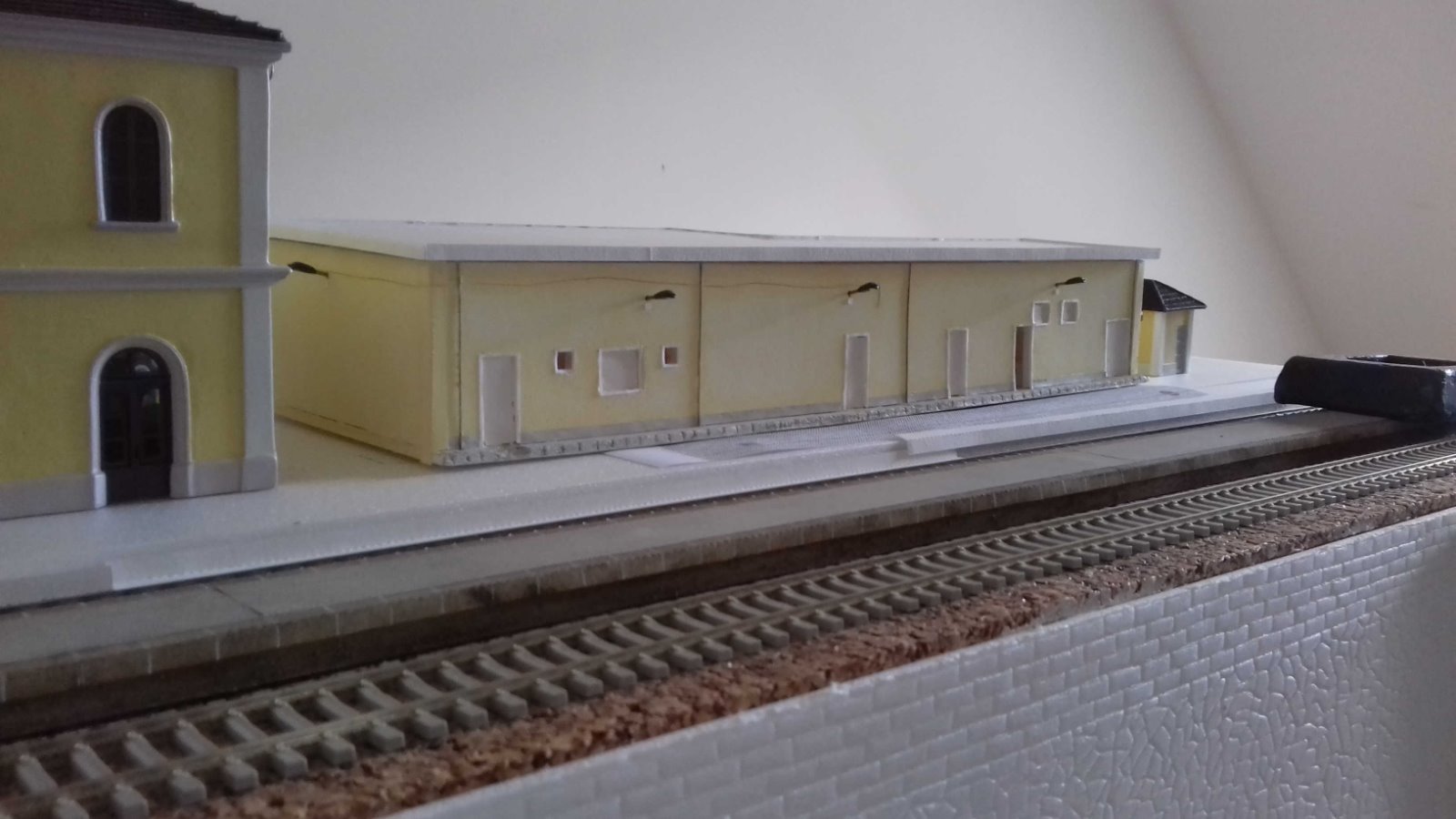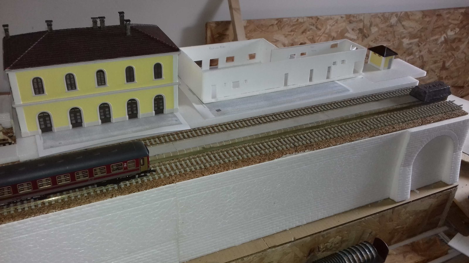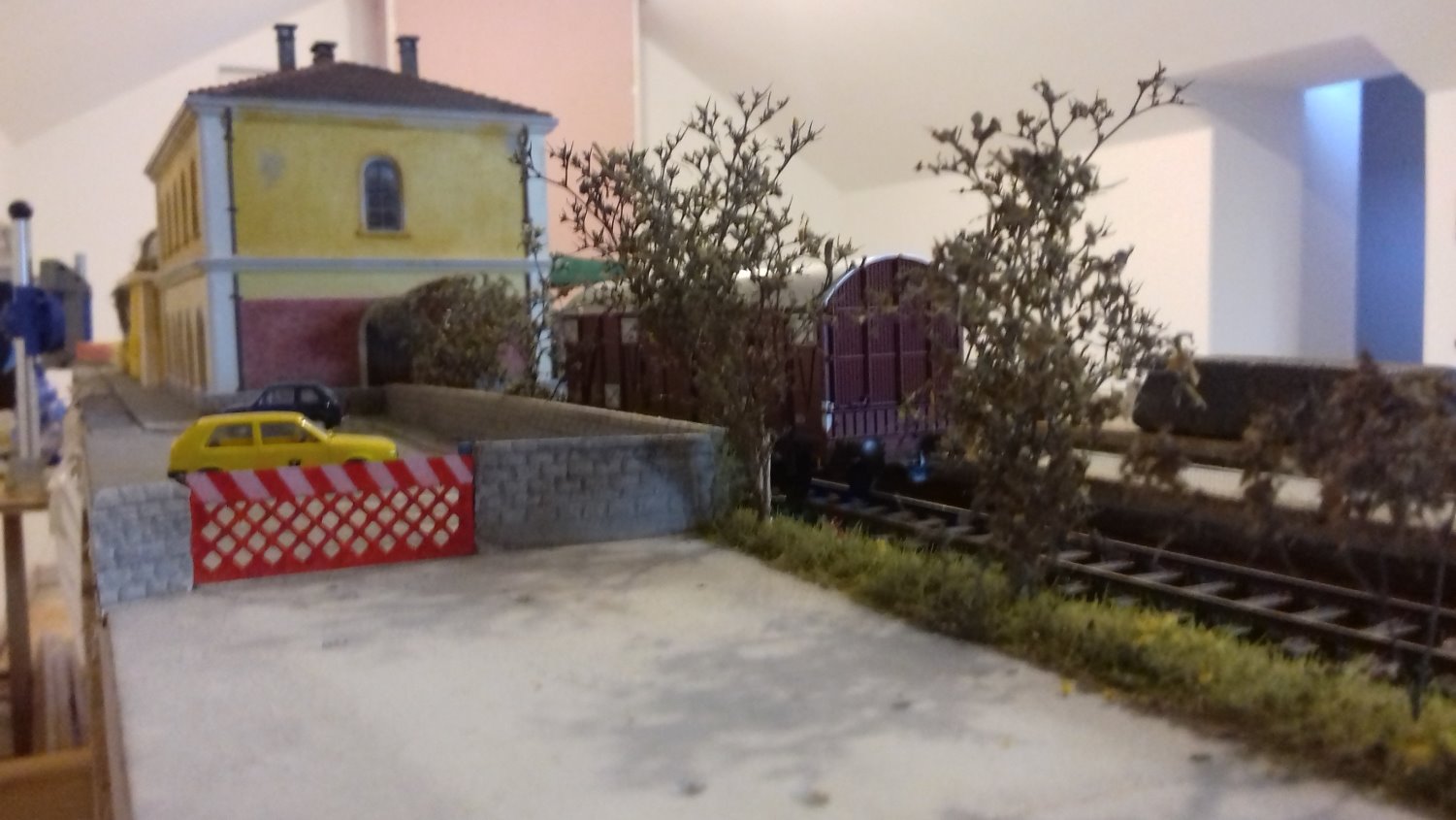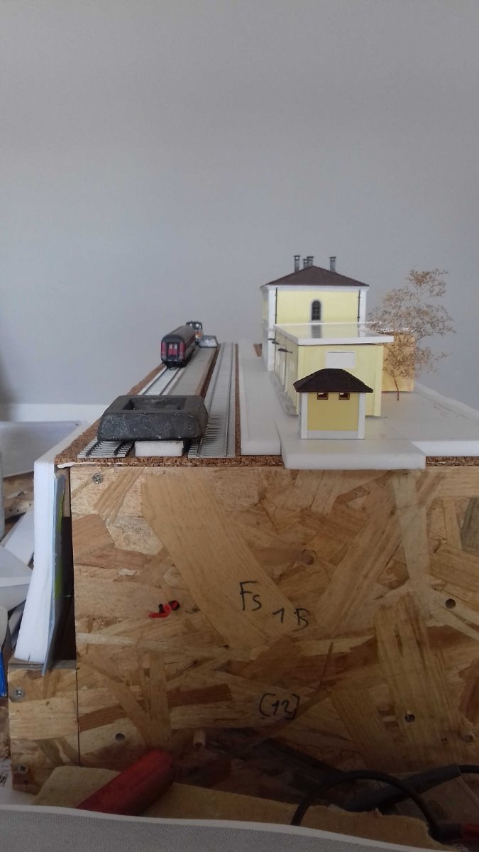 Per ora, solo binari ferroviari sono fisse. La piattaforma centrale è stata realizzata sull'eccellente articolo di Alessandro La Torre (http://www.scalatt.it/bottega%20plastic ... o_zero.htm) di questo sito, solo la decorazione del bordo è diversa dopo aver trovato una soluzione rapida e facile con la carta spessa su cui ho applicato la terra decorato l'ombra naturale. il marciapiedi, i muri, la strada è in "depron" incisa, la stazione e marca "hornby" un'opera di modifica e di patina lo attende. L'altro edificio ispirato dalla stazione di Nicastro è un edificio integrale in costruzione, cartone e carta di diversi spessori, tutto dipinto con pittura a guazzo per bambini, è dotato di un'illuminazione esterna funzionale realizzata modificando un lampione venduto su un sito cinese a prezzi bassi.