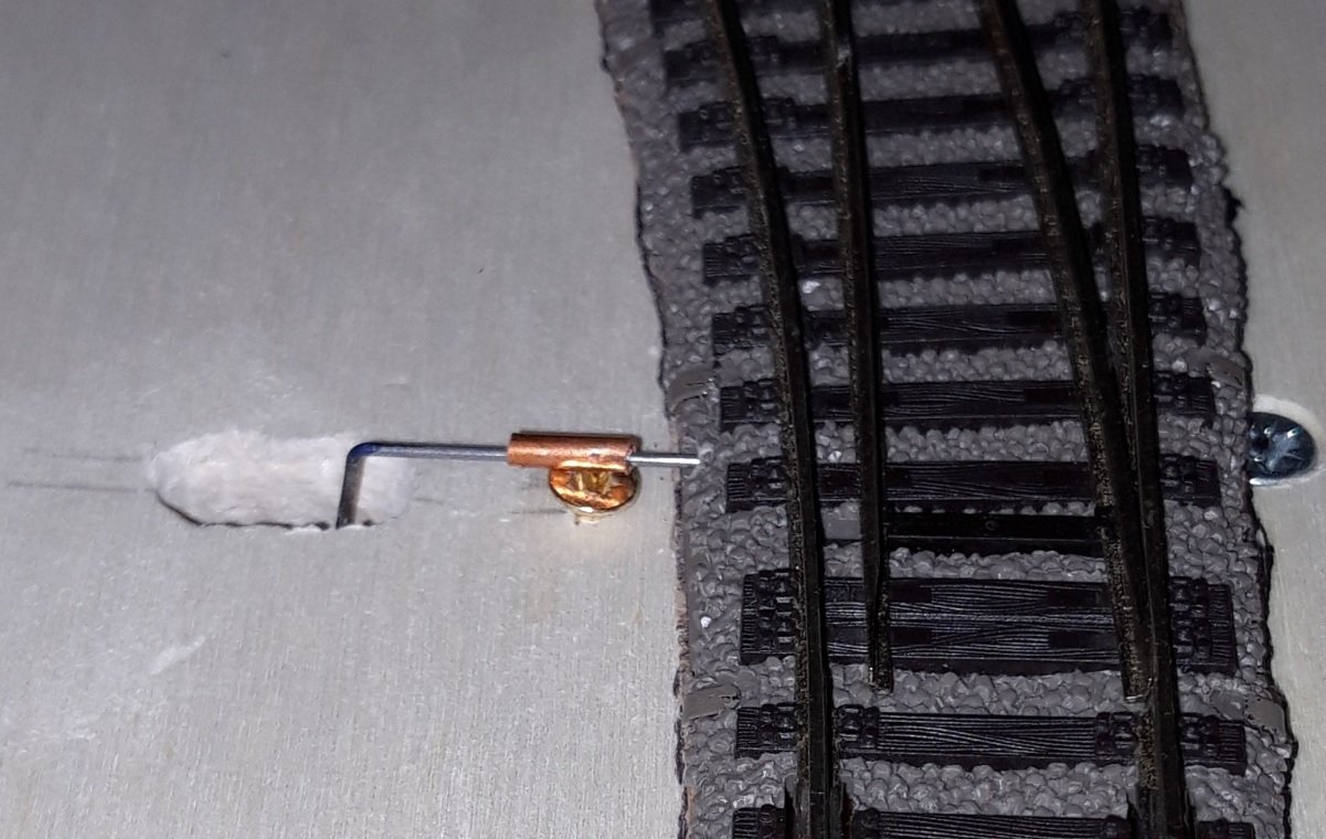 A questo punto si sagoma il filo armonico in modo che abbia una forma tale da rimanere in posizione piatta rispetto alle superfici del deviatoio e abbia anche un minimo di gioco nel suo movimento. Il risultato di qualche prova è quello che vedete nella foto seguente