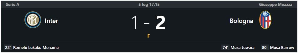 Clamoroso a San Siro, come avrebbe detto Ciotti, la corazzata Inter colpita ed affondata da due siluri sparati dal pedalò Bologna. [245] [256] [246] [258]