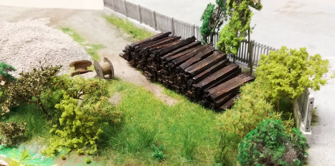 In questi giorni di tranquillità ho ripreso a lavorare su alcune parti del plastico in ristrutturazione. In particolare ho definito in un diorama separato che andrò poi ad inserire sul plastico nella zona 4 (v. Foto precedenti) dove è previsto un piccolo deposito di materiali ferroviari, traversine dismesse e ballast.