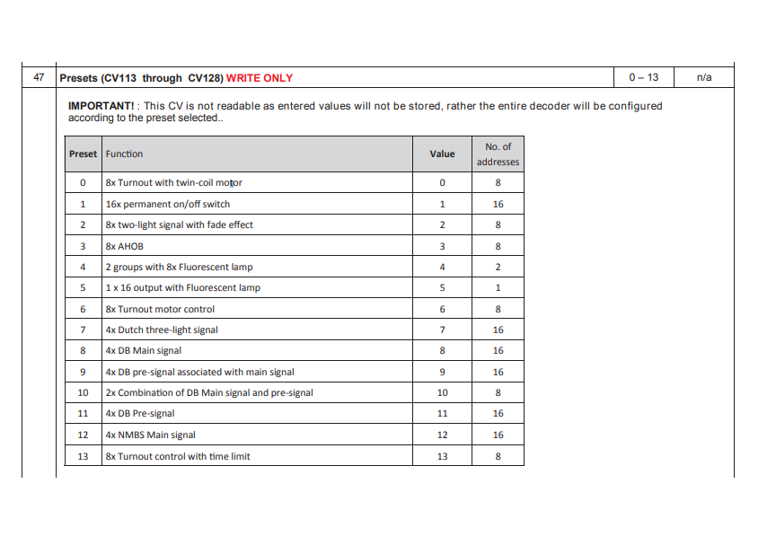 Per modificare il funzionamento del decoder c'è una CV di fondamentale importanza che è la CV 47 con cui si imposta la risposta di tutti e 16 i canali.