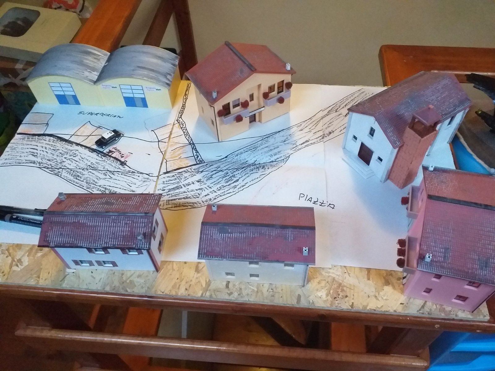 Oggi insieme ai miei aiutanti di 7 e 10 anni abbiamo abbozzato una idea del paese che sorgerà su un piano rialzato. Sotto ci passa il binario dell'ovale. Avevamo pensato a un piccolo supermercato a sinistra in alto (nei due edifici Borghetto legnami) e una piazzetta a destra vicino alla chiesa. La stada dal piano stazione sale a sinistra con una rampa curva in salita.