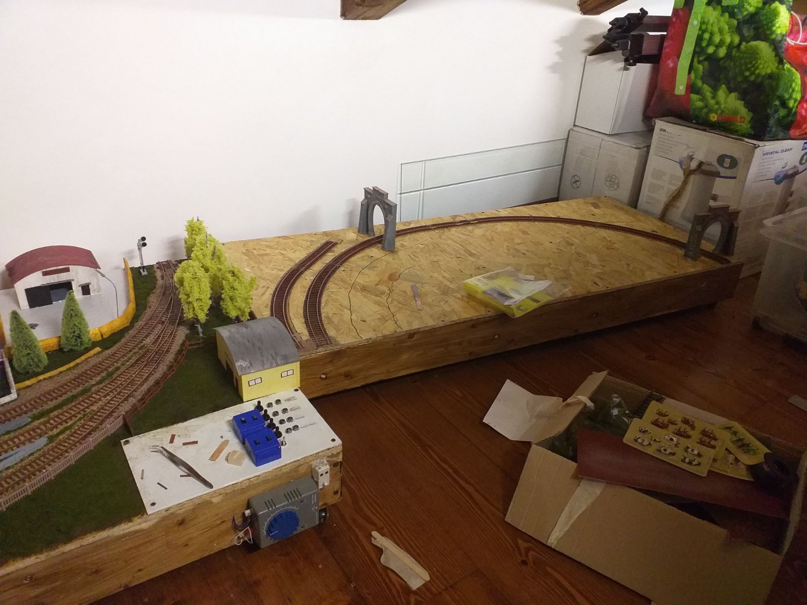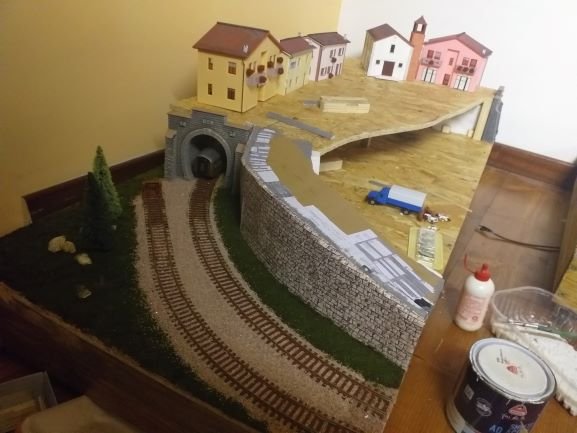 Il plastico è composto da due telai su ruote, quindi ha una visione a 360 gradi, anche se i comandi in analogico sono posizionati davanti. Essendo le misure molto ristrette, per nascondere un po' l'ovale ho pensato ad una ambientazione prealpina. Sto riciclando i pezzi della raccolta hachette che era ambientata in pianura padana che a causa trasferimento e problemi di spazio non ho potuto costruire ed ho optato per questo ovale. Sono un principiante e questa per ora è la mia palestra di esercizio. Allego le foto per dare un'idea dove nel primo modulo i lavori sono abbastanza avanti mentre sul secondo ci sono solo i binari. Praticamente il borgo sorgerà tra i due portali. Siccome non ho spazio per fare una collina scoscesa ho pensato di mettere un muro di contenimento al di sotto del quale ci sono gli edifici del primo modulo. A sinistra c'è l'accenno di rampa di strada che continuerà nel secondo modulo per accedere al piano dove sorgerà il borgo . A destra la strada finirà nel vuoto con grande gioia dei bimbi che già immaginano macchinine che prenderanno il volo nell'ignoto.IpGio ha scritto: ↑martedì 28 aprile 2020, 11:50 Se non sbaglio, per come è impostato il plastico, tu desideri avere un punto di osservazione che gira intorno a 360°, vero?