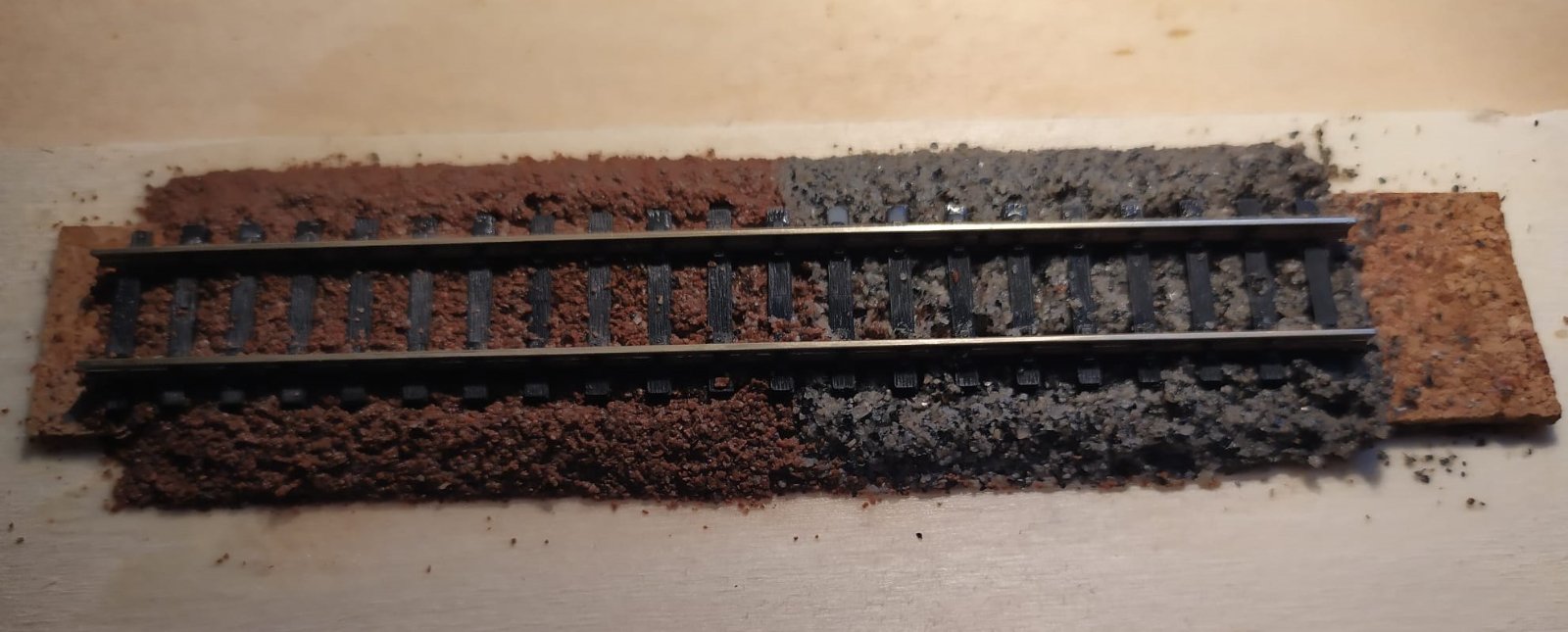 Poi per il colore non farti problemi; il pietrisco veniva (e viene) dalle cave nelle vicinanze e quindi può avere varie tonalità a seconda della composizione chimica del suolo. E non farti problemi nemmeno a fare tratti di un colore e tratti di un'altro, come al vero, quando un tratto di ferrovia viene rincalzato.