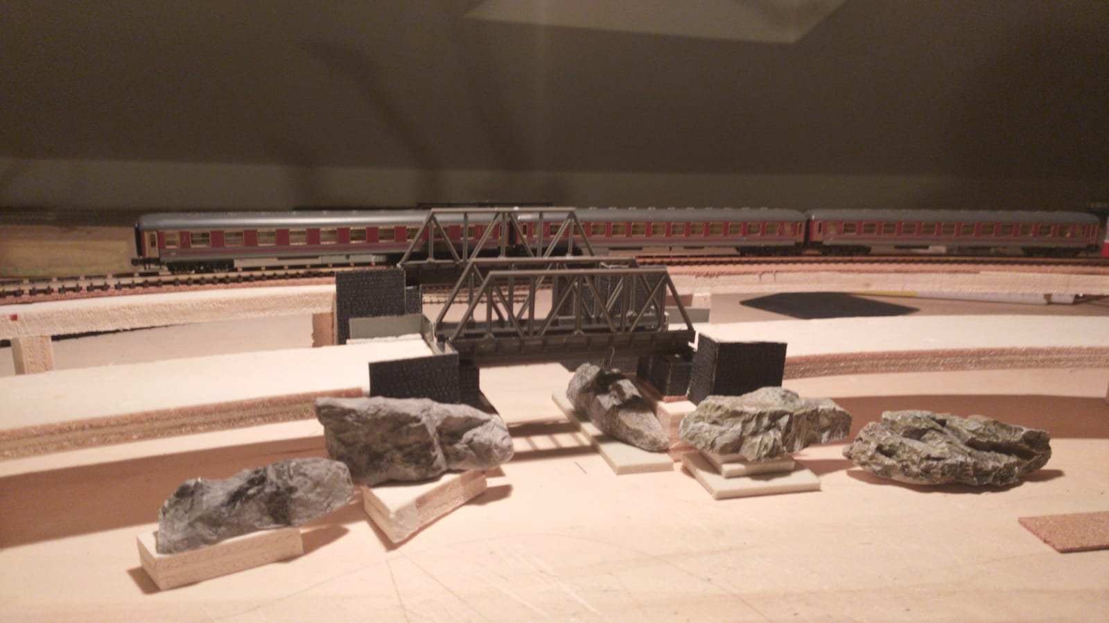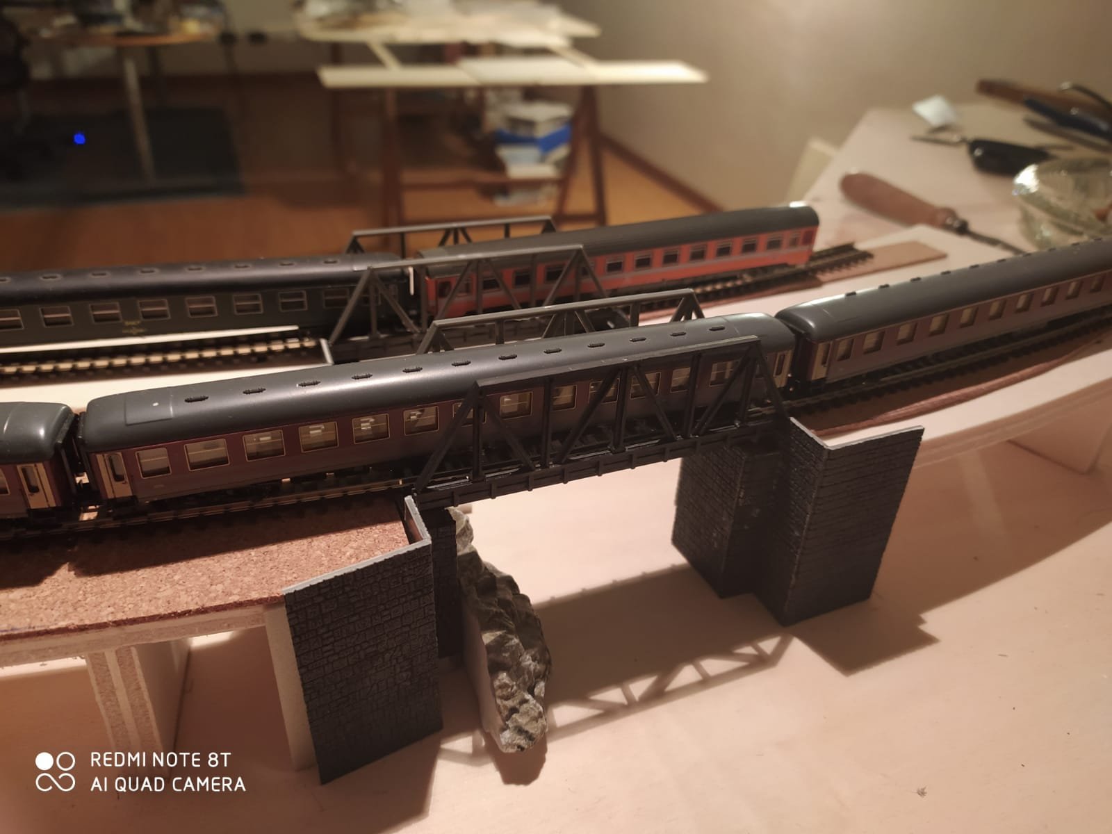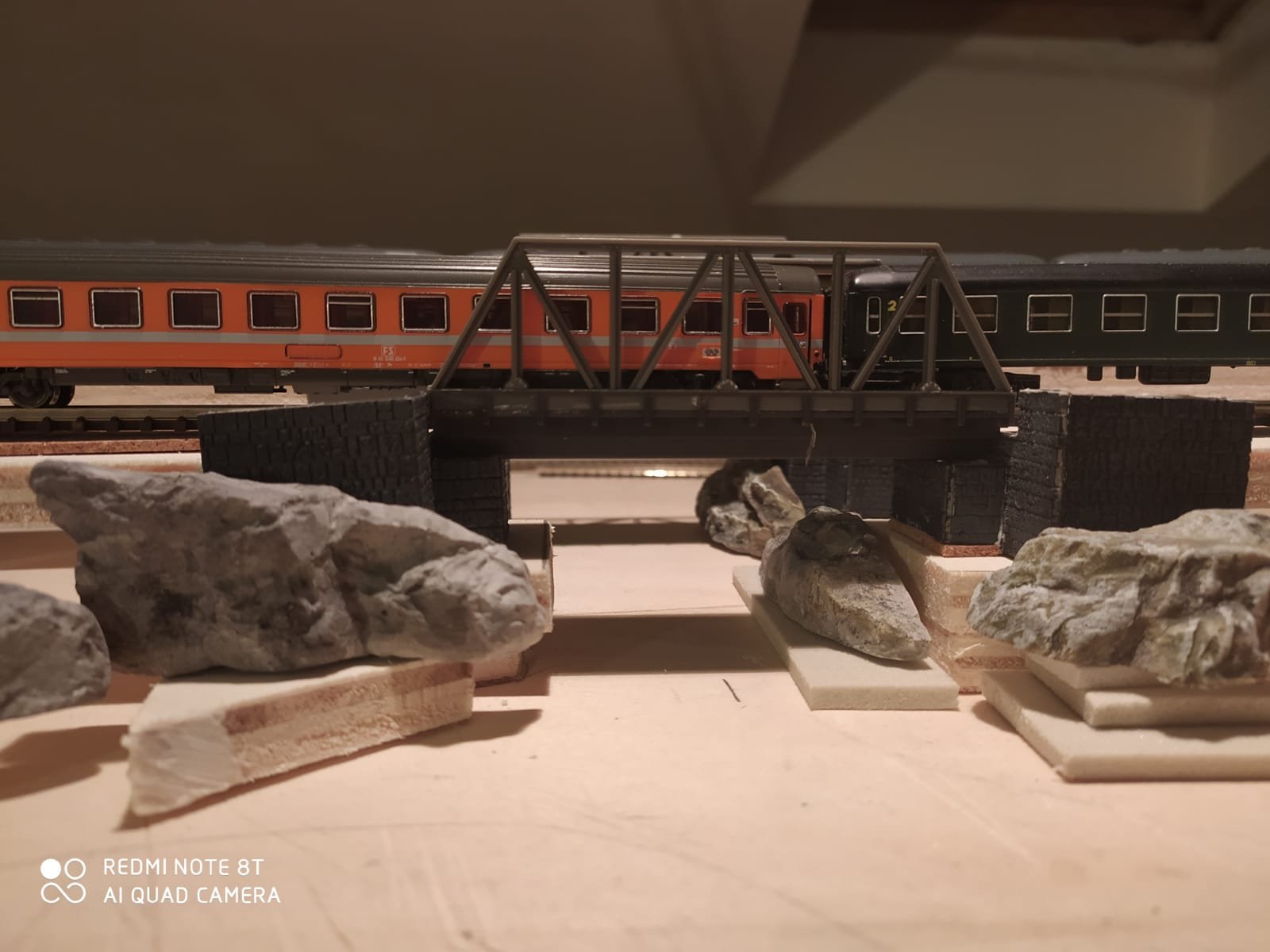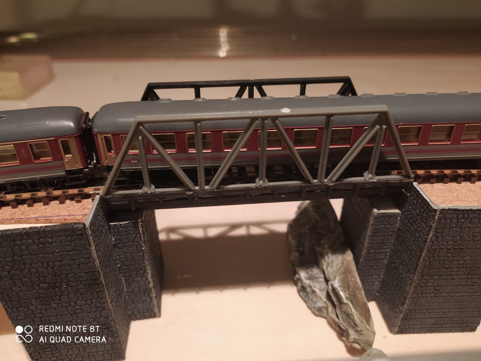 Tutto è ancora da rifinire a livello sia di pittura che di finitura dei particolari (i piloni che reggono la struttura in acciaio saranno coperti con una finta lastra di pietra realizzata con della plastica) e le rocce che si vedono sono solo per figura anche se l'idea è che i ponti sia stati costruiti su un supporto roccioso.