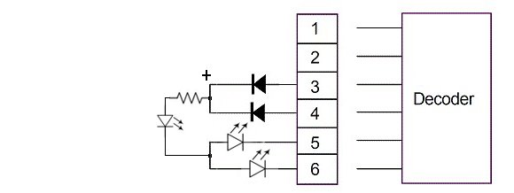 Io collegherei l'anodo del led ( + resistenza) dopo i due diodi uscenti dal 3 e 4 nella figura di Digtrain (li c'è il + (positivo).