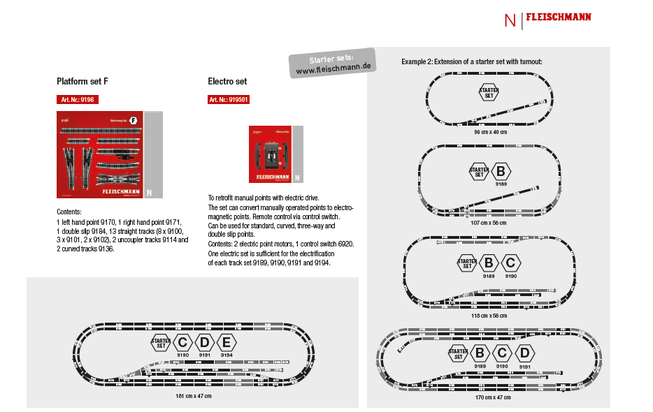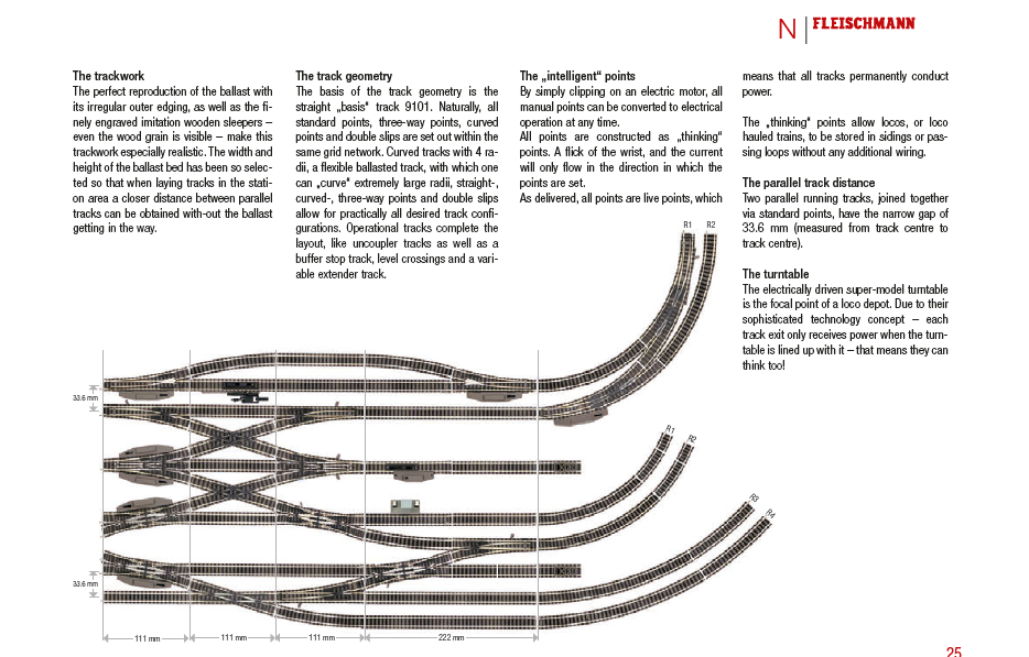 Per quanto riguarda i binari, i Fleischmann con massicciata sono degli ottimi binari, resistenti e duraturi; li puoi trovare usati anche su piattaforme come ebay, sia qui che in Germania, trovando spesso offerte vantaggiose per più pezzi. Prenderne qualche binario in più e provare a comporre qualche tracciato alternativo potrebbe essere interessante; ti allego la foto delle geometrie che puoi trovare anche sui cataloghi Fleischmann.