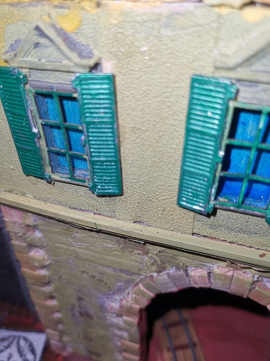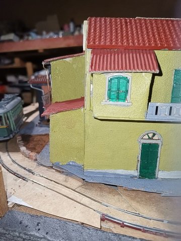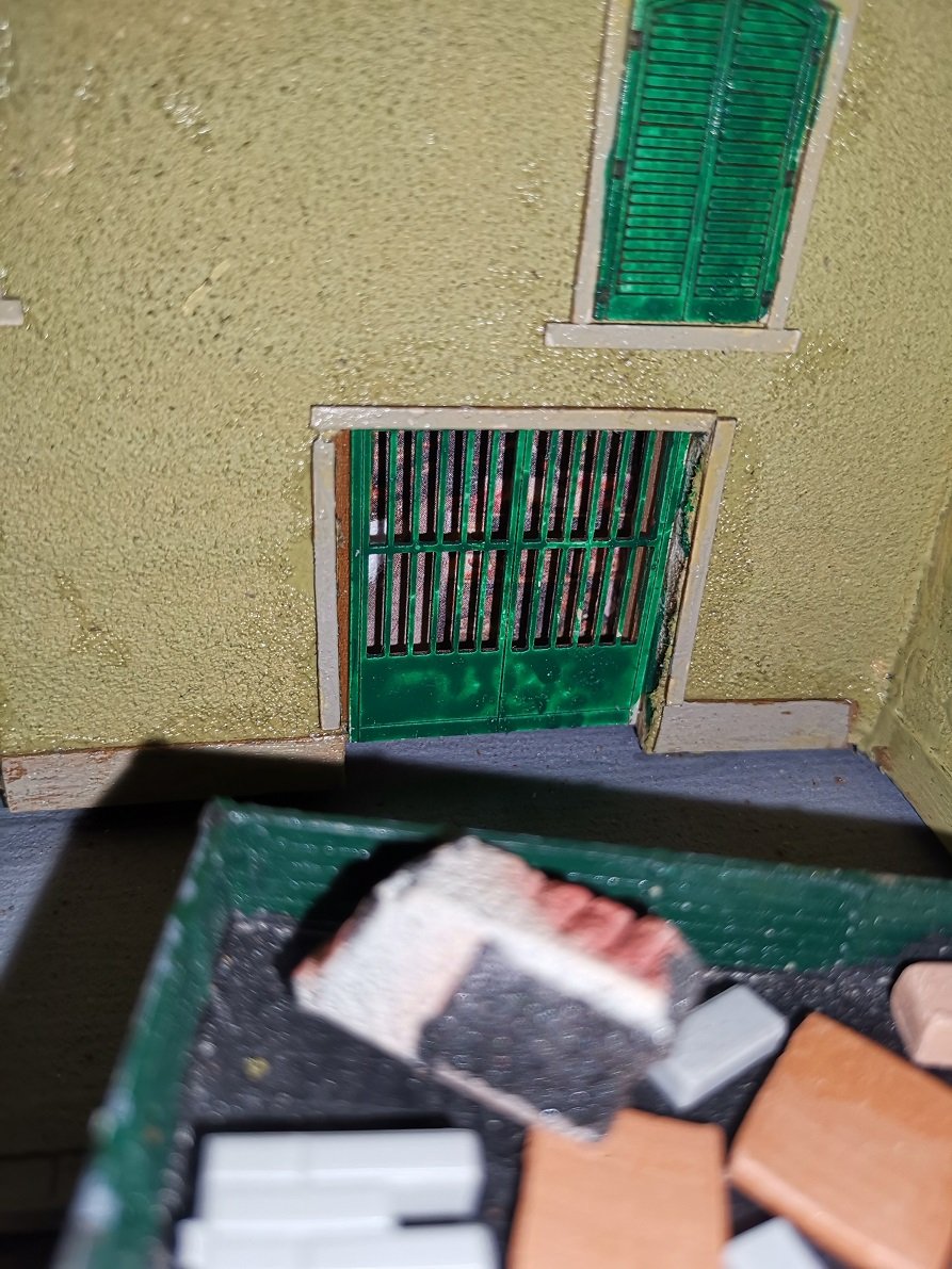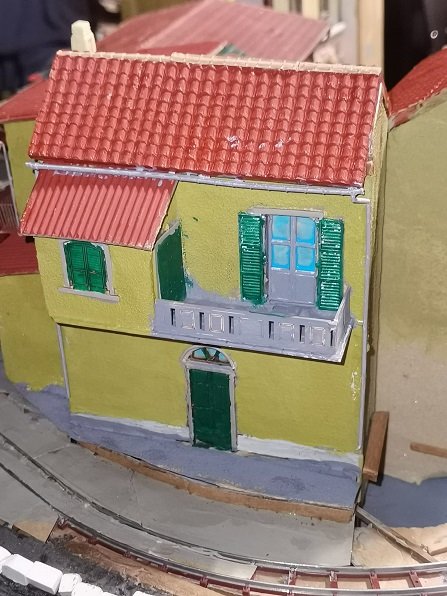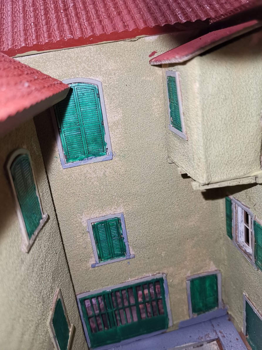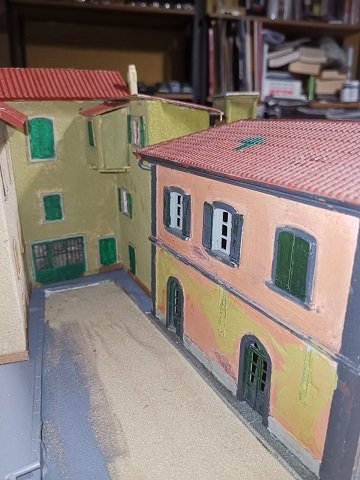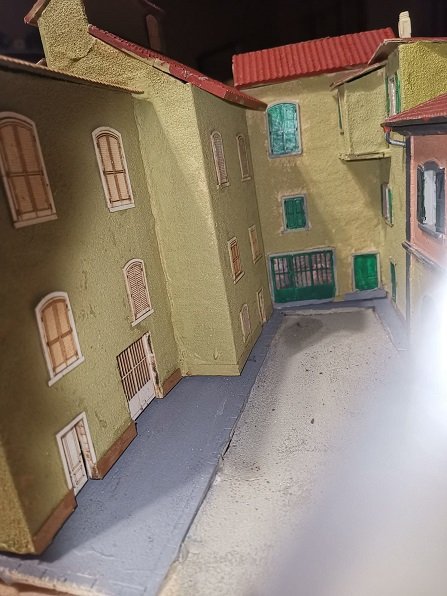 Lo so...alcuni particolari come le finestre sono un po' sommari. Il plastico nelle mie intenzioni doveva essere a costo zero, cioè utilizzando materiale di avanzo, materiale povero, o già in mio possesso. Le finestre di carta stampate le avevo preparate anni fa e mai messe in opera. per il resto le case sono fatte con scatole delle scarpe, carta vetrata e cartoncino ondulato proveniente da una ottima confezione di vini... e questa è stata la parte più piacevole del lavoro. Il fine ultimo di svuotare le scatole contenenti avanzi modellistici stratificati nel tempo però non è stato raggiunto..le tre grosse scatole sono ancora piene di pezzi da utilizzare.