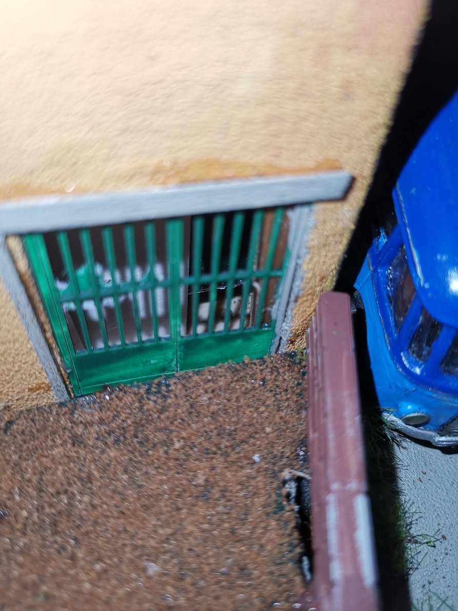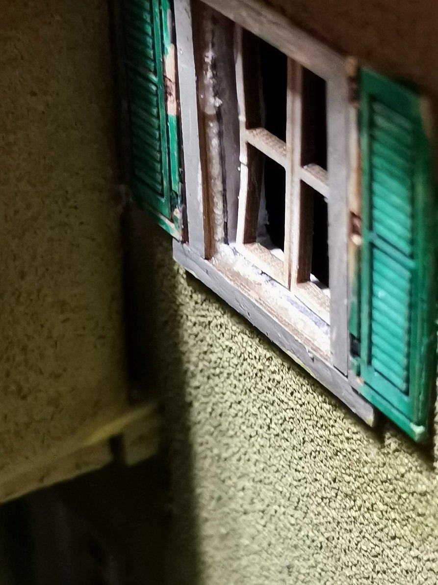 Lo so...alcuni particolari come le finestre sono un po' sommari. Il plastico nelle mie intenzioni doveva essere a costo zero, cioè utilizzando materiale di avanzo, materiale povero, o già in mio possesso. Le finestre di carta stampate le avevo preparate anni fa e mai messe in opera. per il resto le case sono fatte con scatole delle scarpe, carta vetrata e cartoncino ondulato proveniente da una ottima confezione di vini... e questa è stata la parte più piacevole del lavoro. Il fine ultimo di svuotare le scatole contenenti avanzi modellistici stratificati nel tempo però non è stato raggiunto..le tre grosse scatole sono ancora piene di pezzi da utilizzare.