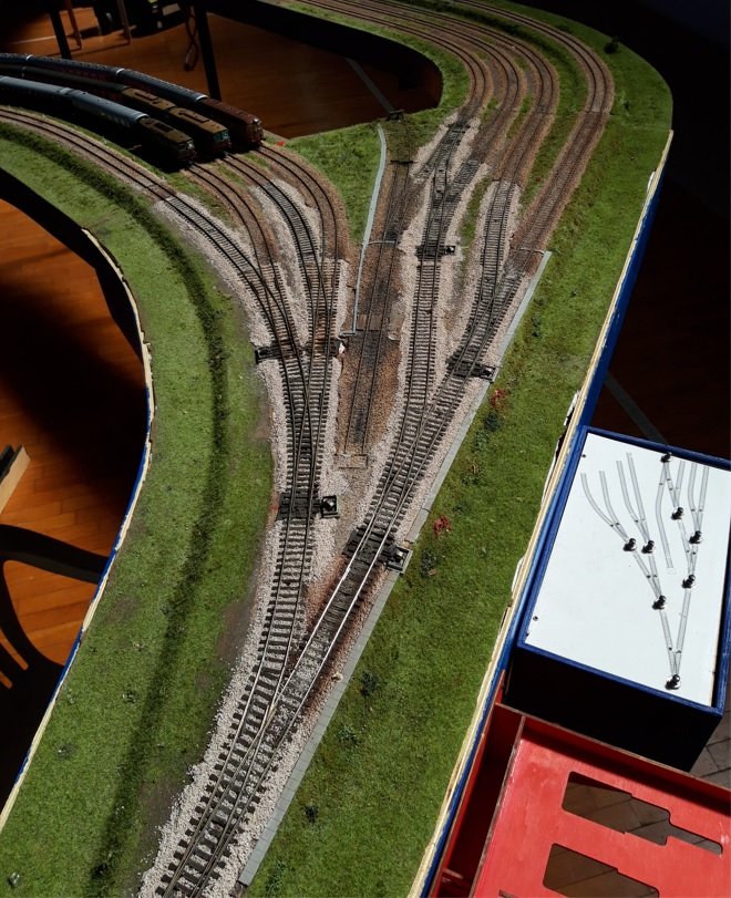 Nella foto precedente potete vedere in basso i componenti di comando dei deviatoi di entrata mentre in alto ci sono gli elementi per il funzionamento dell’instradamento automatico in uscita di cui avete letto in precedenza.