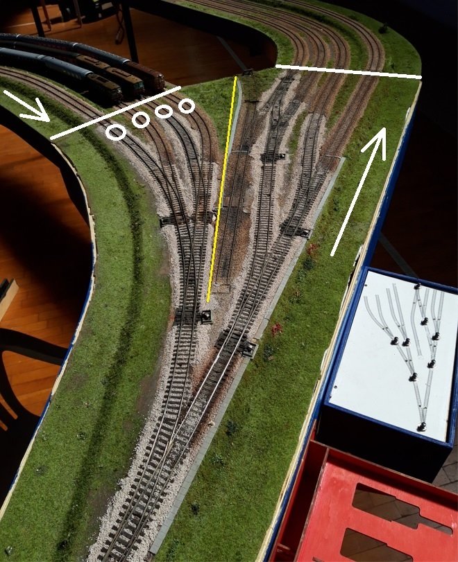 Ognuno dei quattro binari del deposito ha stranamente un suo congegno elettronico di inversione di polarità. Chi ha realizzato l’impianto elettrico ha meritoriamente cercato di radunare tutta l’apparecchiatura elettronica nel modulo radice del deposito; le due linee bianche della figura seguente indicano i limiti strutturali del modulo radice, mentre la linea gialla separa la zona dei deviatoi di entrata da quella dei deviatoi di uscita.