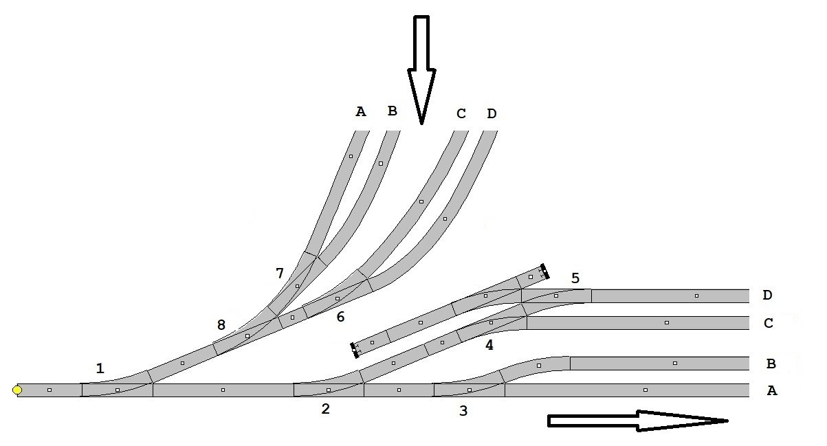 In entrata abbiamo 4 possibili itinerari, indicati con le lettere A, B, C e D, che implicano ciascuno una certa disposizione dei deviatoi 1, 2, 3, 4 e 5.