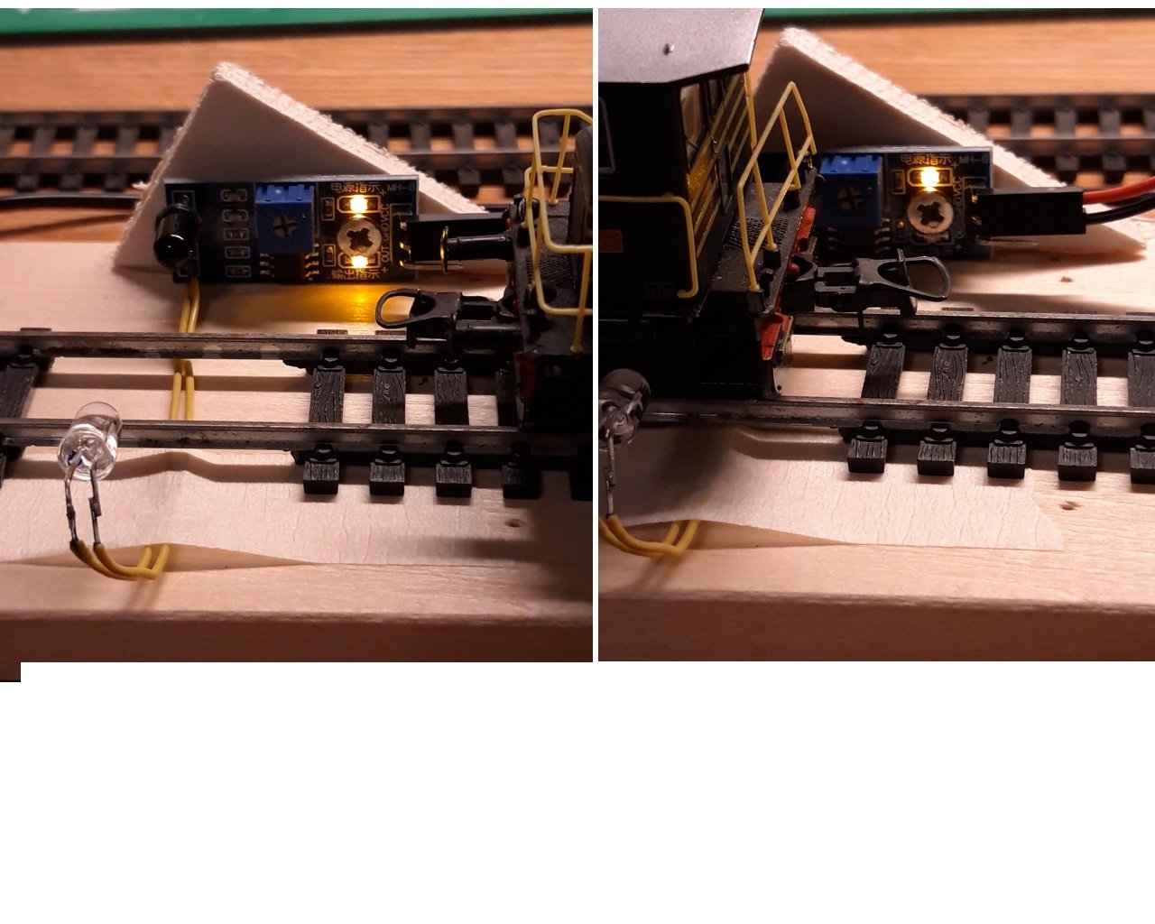 Usati in altro modo, ho dissaldato il diodo emettitore e l’ho ricollegato alla basetta con due fili elettrici lunghi tanto quanto basta per mettere l’emettitore puntato verso il ricevitore con in mezzo lo spazio per il passaggio di un convoglio in scala H0. In questo caso converrebbe dotare i diodi di tubicini scuri che li riparino da interferenze luminose e sostegni fissi.
