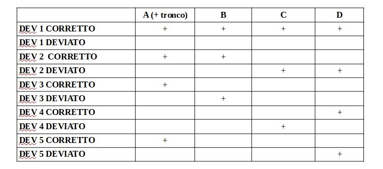 Se mettiamo queste combinazioni su una tabella otteniamo questo risultato (dove mi sono permesso di attivare l’itinerario dal binario D al tronchino di sosta in contemporanea con l’attivazione dell’itinerario verso il binario A).