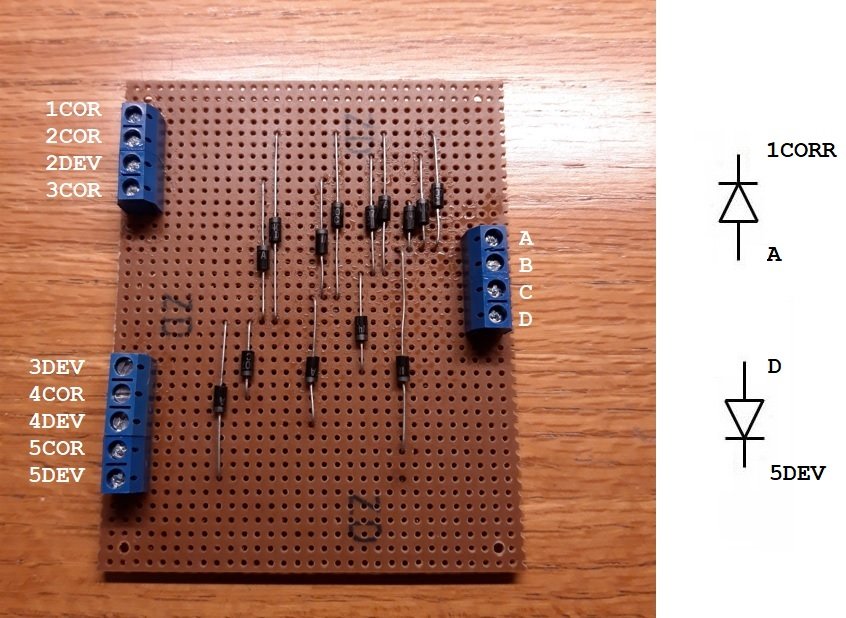Il funzionamento della matrice è semplice: dalle piste relative ai quattro itinerari (A, B, C e D) partono dei collegamenti verso le piste dei deviatoi secondo i dati della tabella. Tali collegamenti sono realizzati con i diodi posti in modo da far passare l’impulso dalla pista dell’itinerario verso quelle dei deviatoi interessati. In questo modo non ci potranno essere ritorni elettrici che possono muovere deviatoi non necessari.