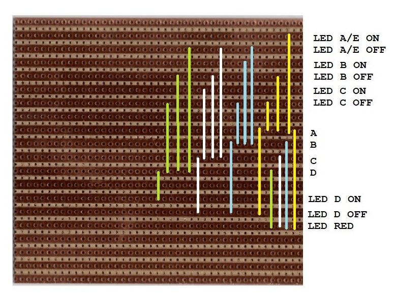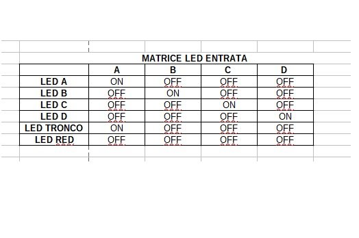 La matrice per i led del sinottico è relativamente semplice e quindi riporto direttamente la tabella da cui prendere spunto per la realizzazione e i collegamenti.
