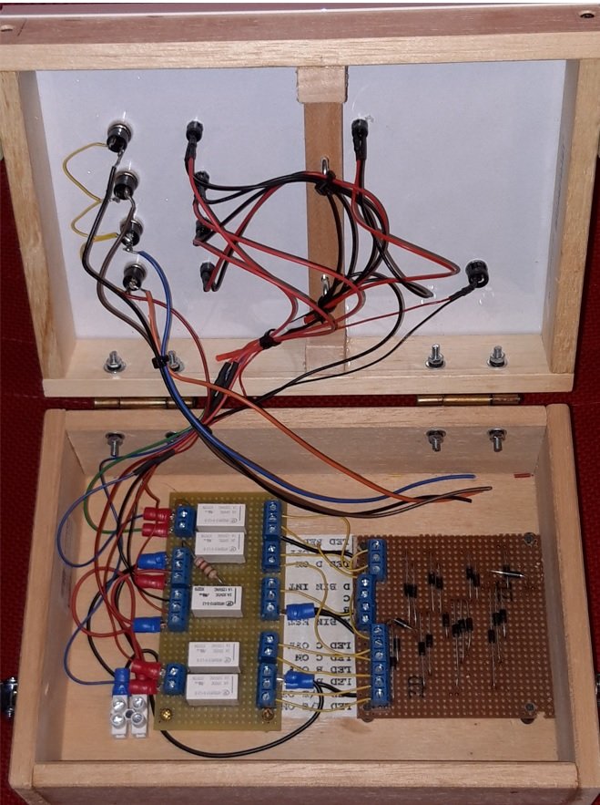 Nella modestia delle mie conoscenze di elettrotecnica ed elettronica, ho pensato di usare delle sempiterne matrici di diodi per creare gli itinerari partendo da un unico comando, tanto in entrata che in uscita. Se in entrata, la pressione del pulsante relativo al binario desiderato, tramite matrice e una serie di relé bistabili, mi permette di creare l’itinerario desiderato, altrettanto avviene in uscita, dove il pulsante è sostituito da un relé monostabile comandato dall’attivazione del sensore a raggi infrarossi al passaggio del convoglio.