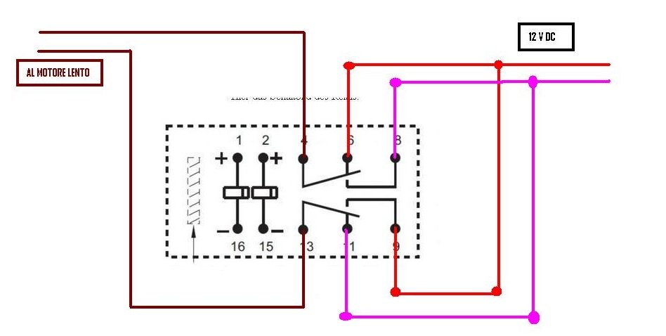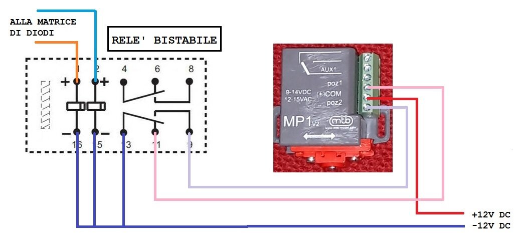 Posto lo schema dei collegamenti tra il relé bistabile (comandato da impulsi positivi attraverso le piste della matrice di diodi) e il motore MP1.