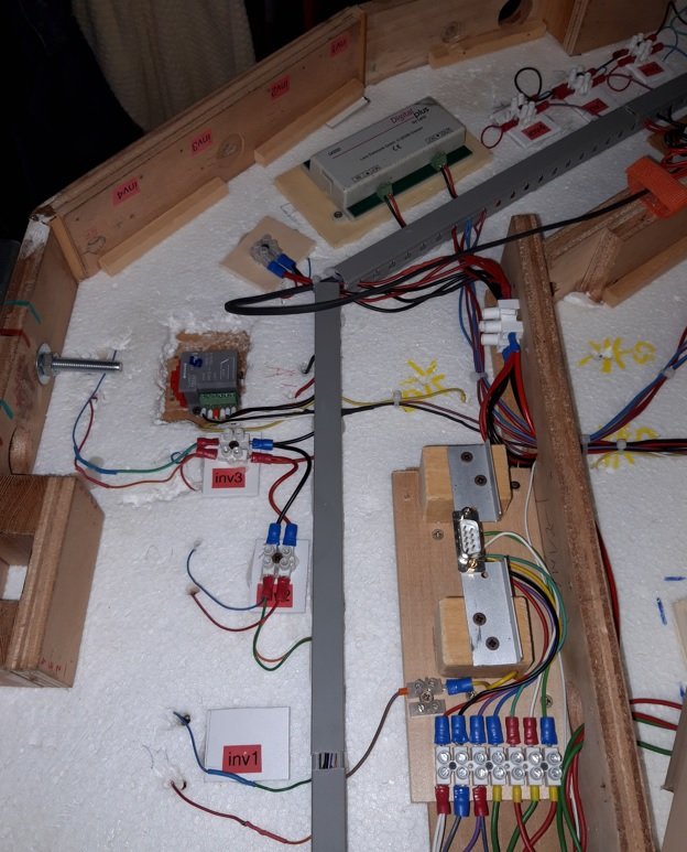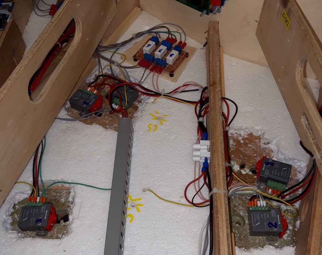 Come spesso accade, quando si mette mano ad un modulo precedentemente cablato, occorre mediare tra la disposizione dei cavi posati in precedenza e il nuovo assetto dell’impianto elettrico, cercando di disporre i nuovi componenti nel miglior modo possibile. Per quanto si faccia attenzione, il risultato non dà certo l’idea dell’impianto elegante e pulito, ma tant’è….