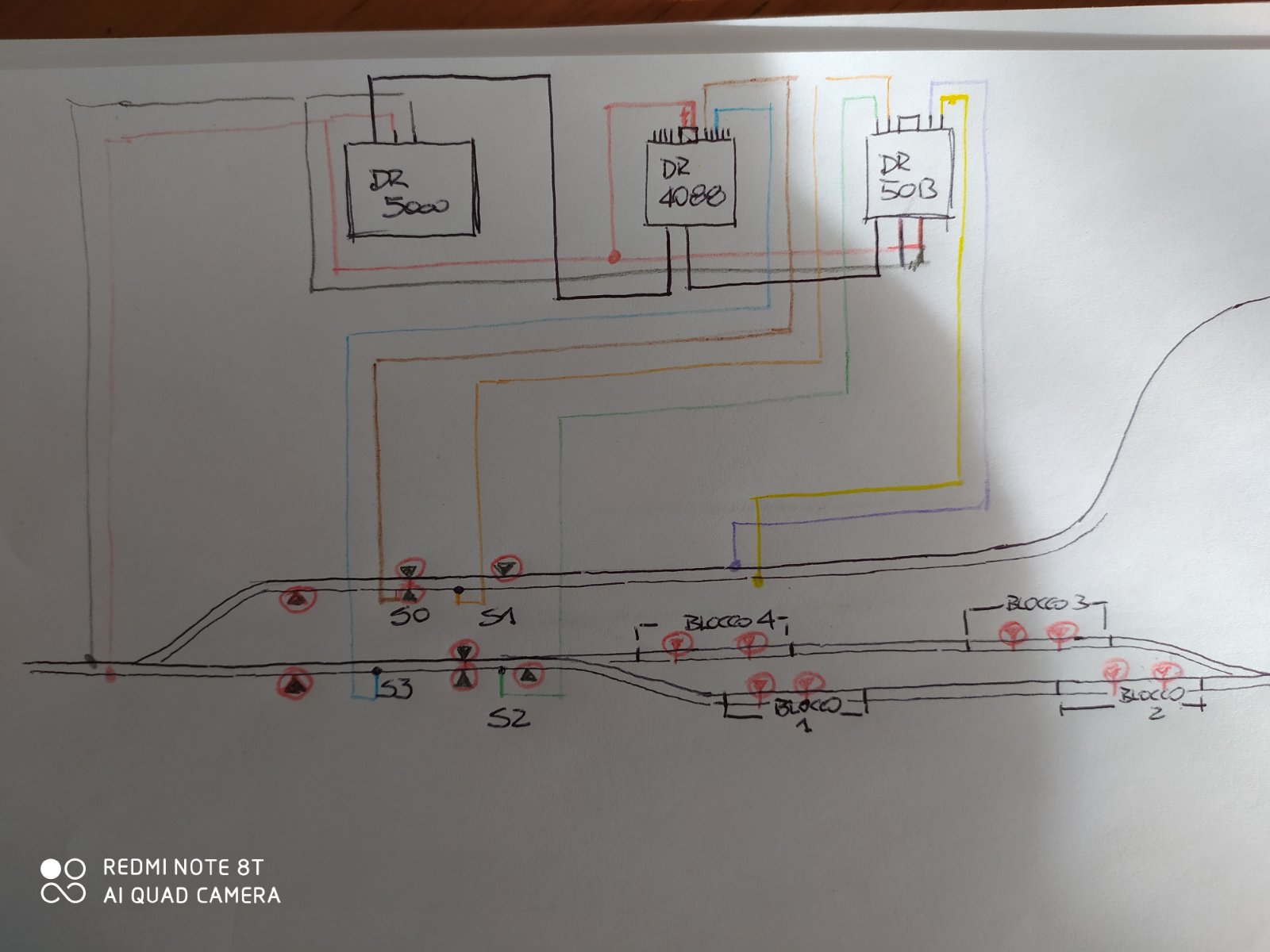 Quello che vorrei fare è risolvere la problematica con la DR 5013 utilizzando solo la linea gialla, ovvero inserire, come da schema allegato al manuale della dr5013, i i sezionamenti con i sensori solo sulla linea gialla... mi è stato detto che è possibile ed io ci credo... ma non sono capace di realizzarlo, o meglio lo realizzo la la loco va sempre in corto.