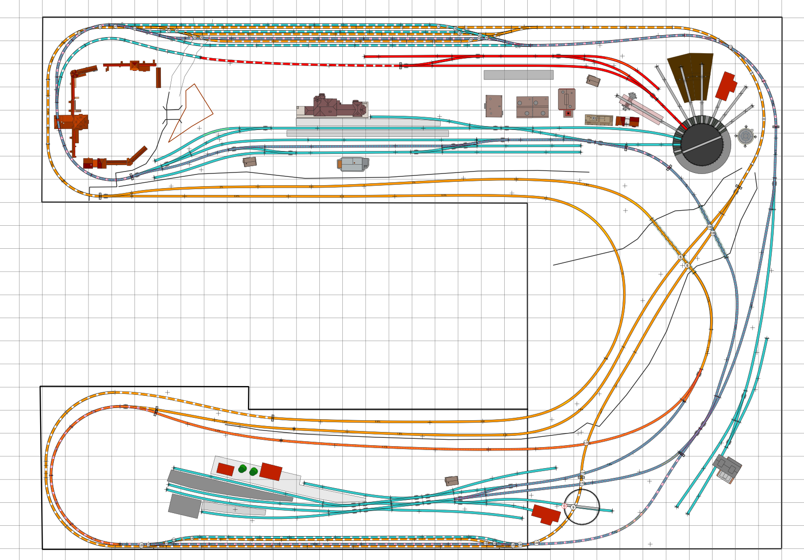Per iniziare vi ripropongo il progetto del plastico che prevede una linea di parata (nel disegno nel disegno di colore arancione) con due stazione nascoste ed una linea secondaria (nel disegno di colore azzurro) che prevede anch'essa due stazioni nascoste ed una stazione passante (Altenburg) ed una di testa (Munster) con una diramazione ad una zona mineraria. Ad oggi la parte maggiormente completa è la stazione di Munster, anche se come vedrete dalle foto mancano ancora molti dettagli (marmotte, passacavi e paesaggistica).