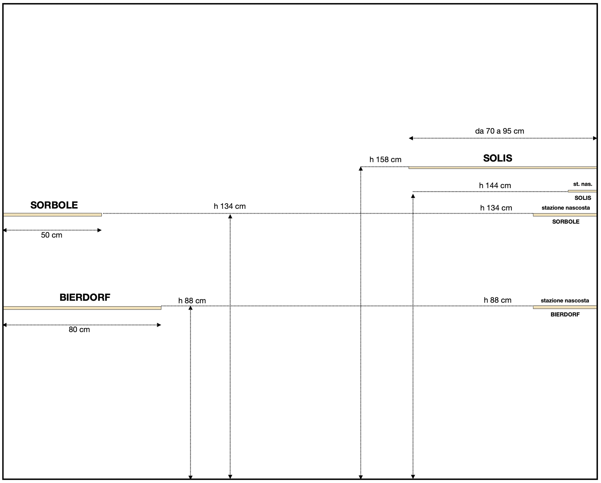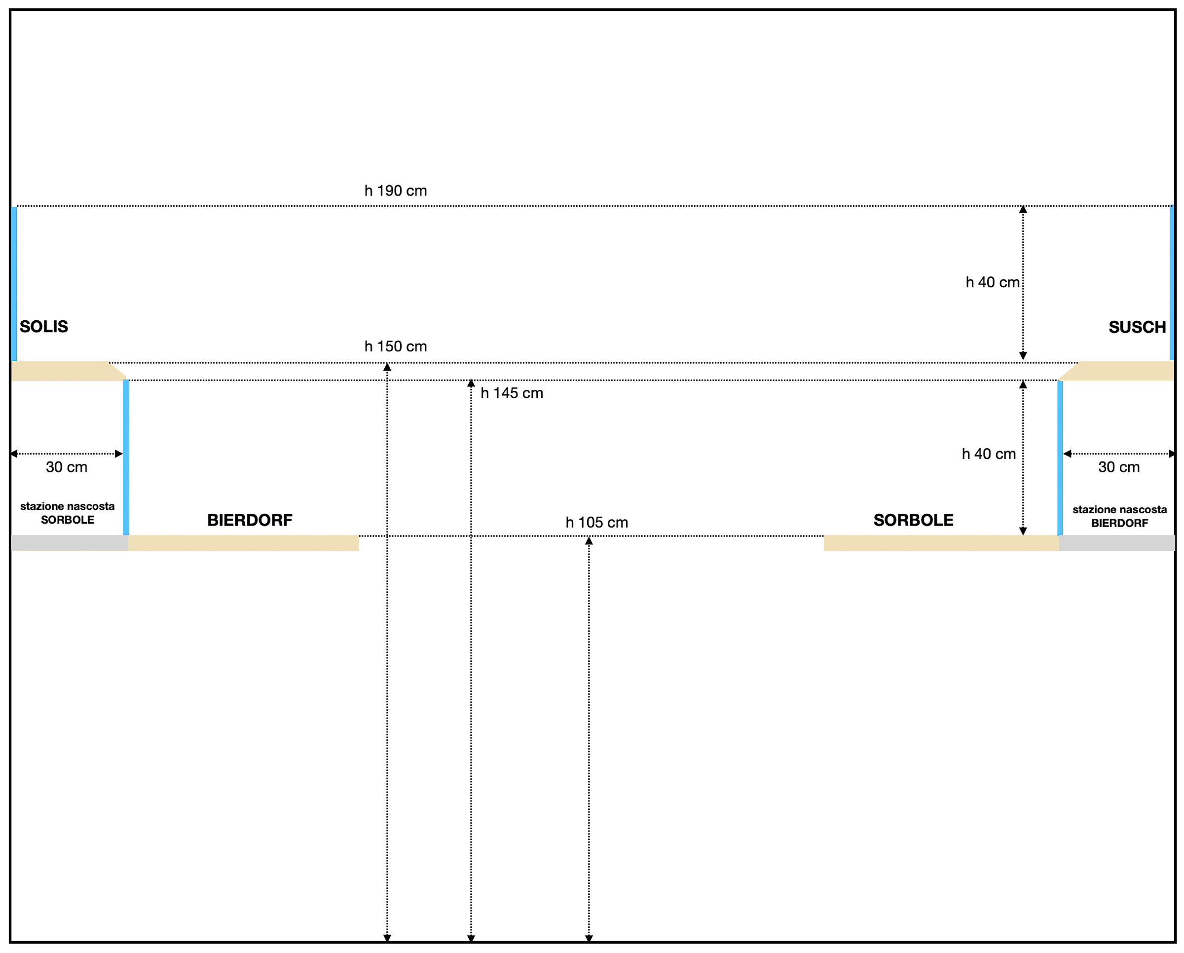 Il plastico in H0 si sviluppa a 105 cm dal suolo e, sullo stesso piano, si situano le stazioni di “Bierdorf” (DB) e “Sorbole” (FS), una di fronte all’altra.