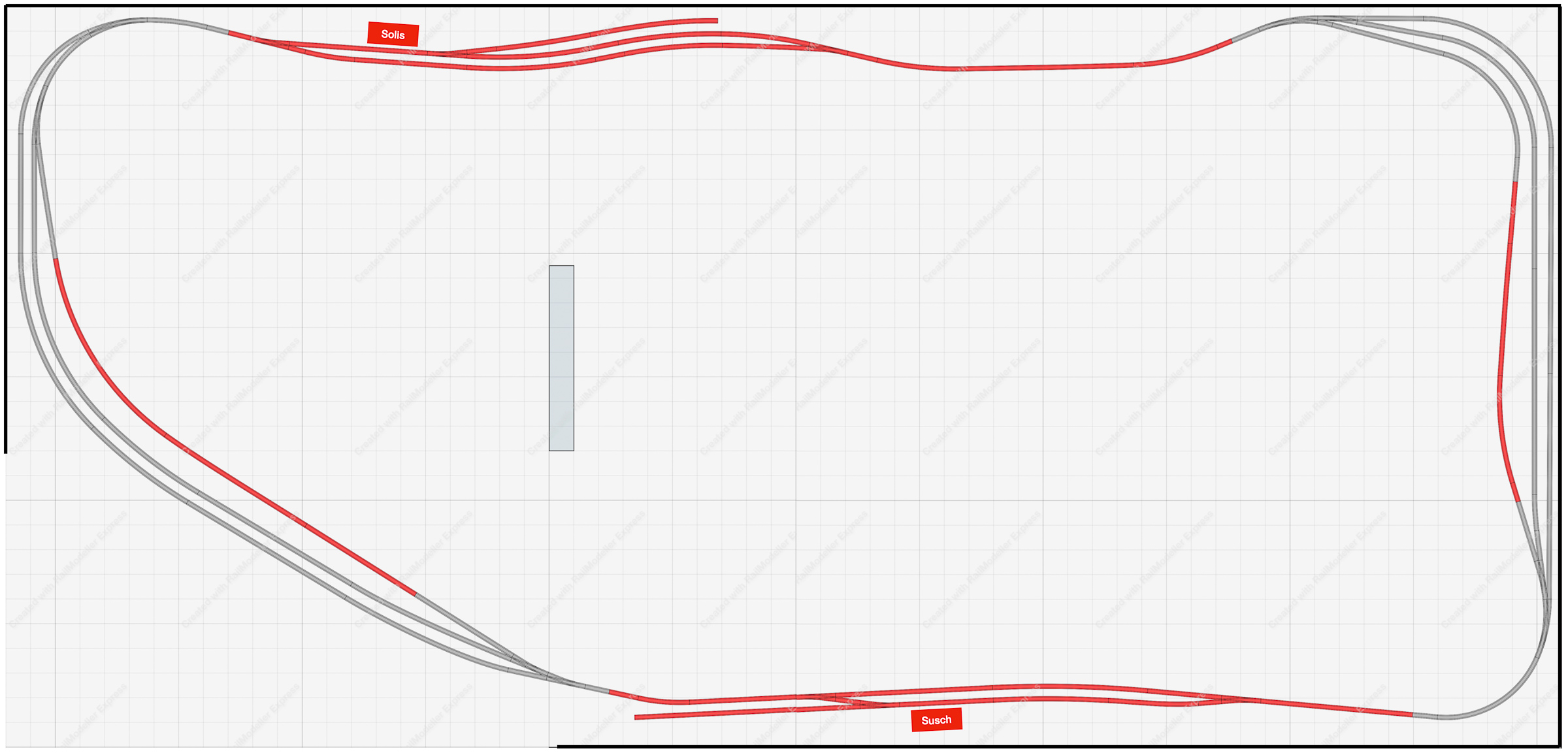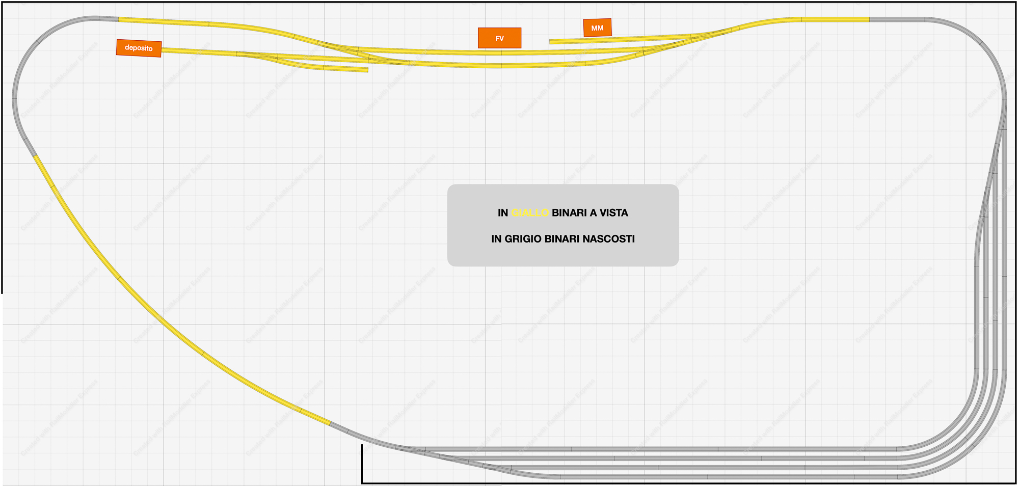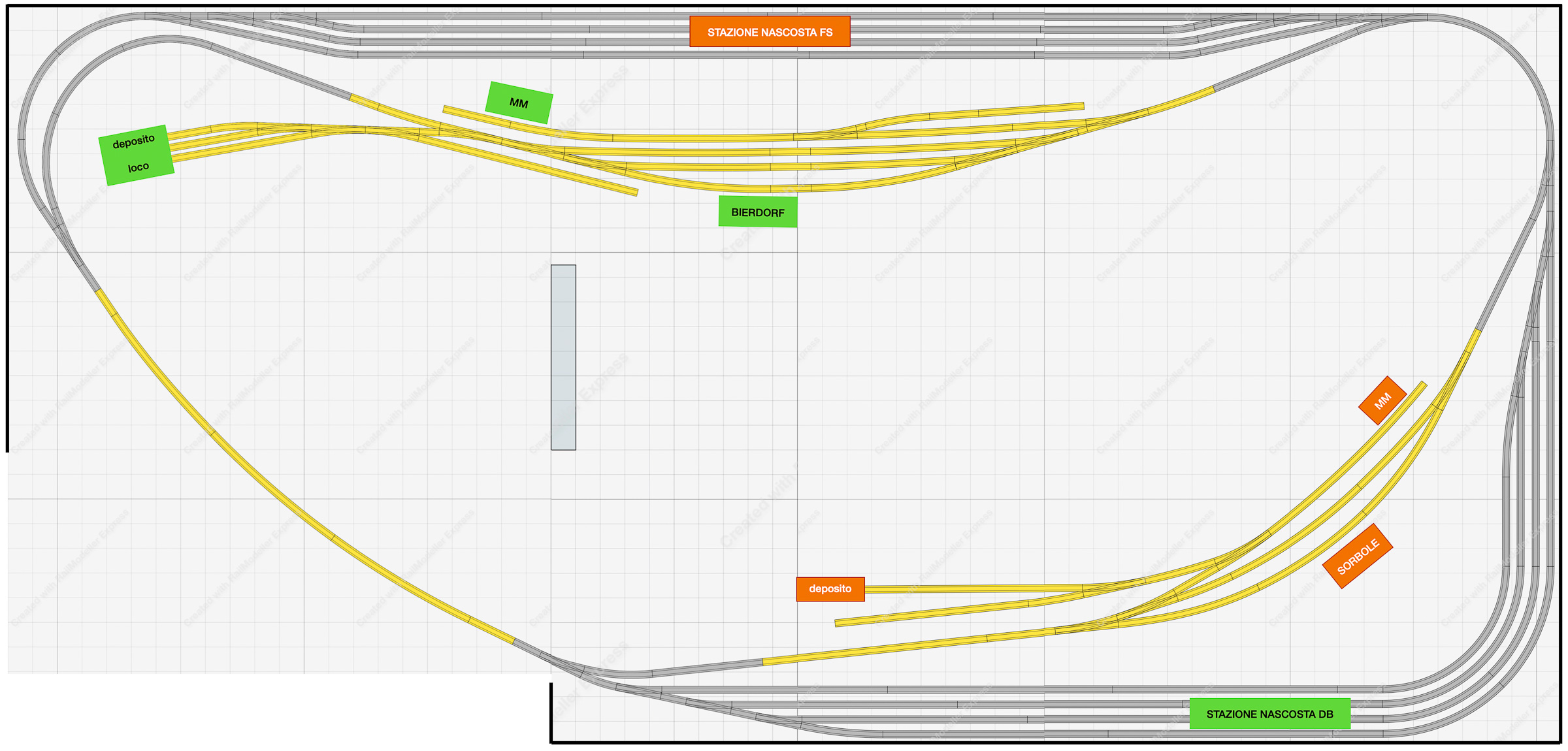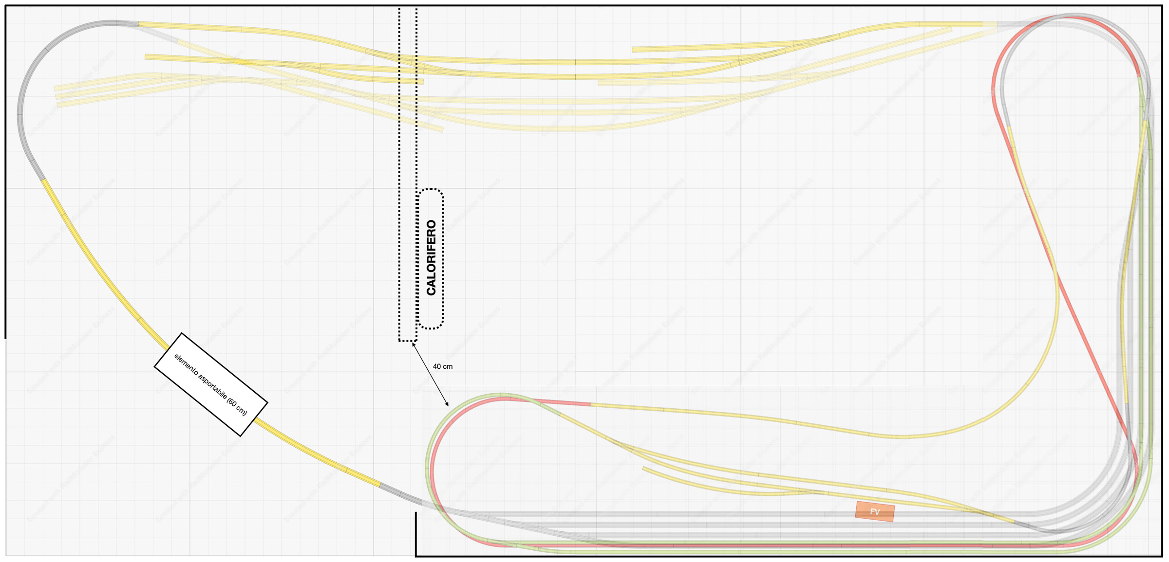 - la linea da parata è in comune tra i due tracciati in H0 e quindi non sarà possibile far circolare contemporaneamente treni FS e DB su quel lato del tracciato (in “Tris” invece i due plastici in H0 erano indipendenti e a due livelli differenti).