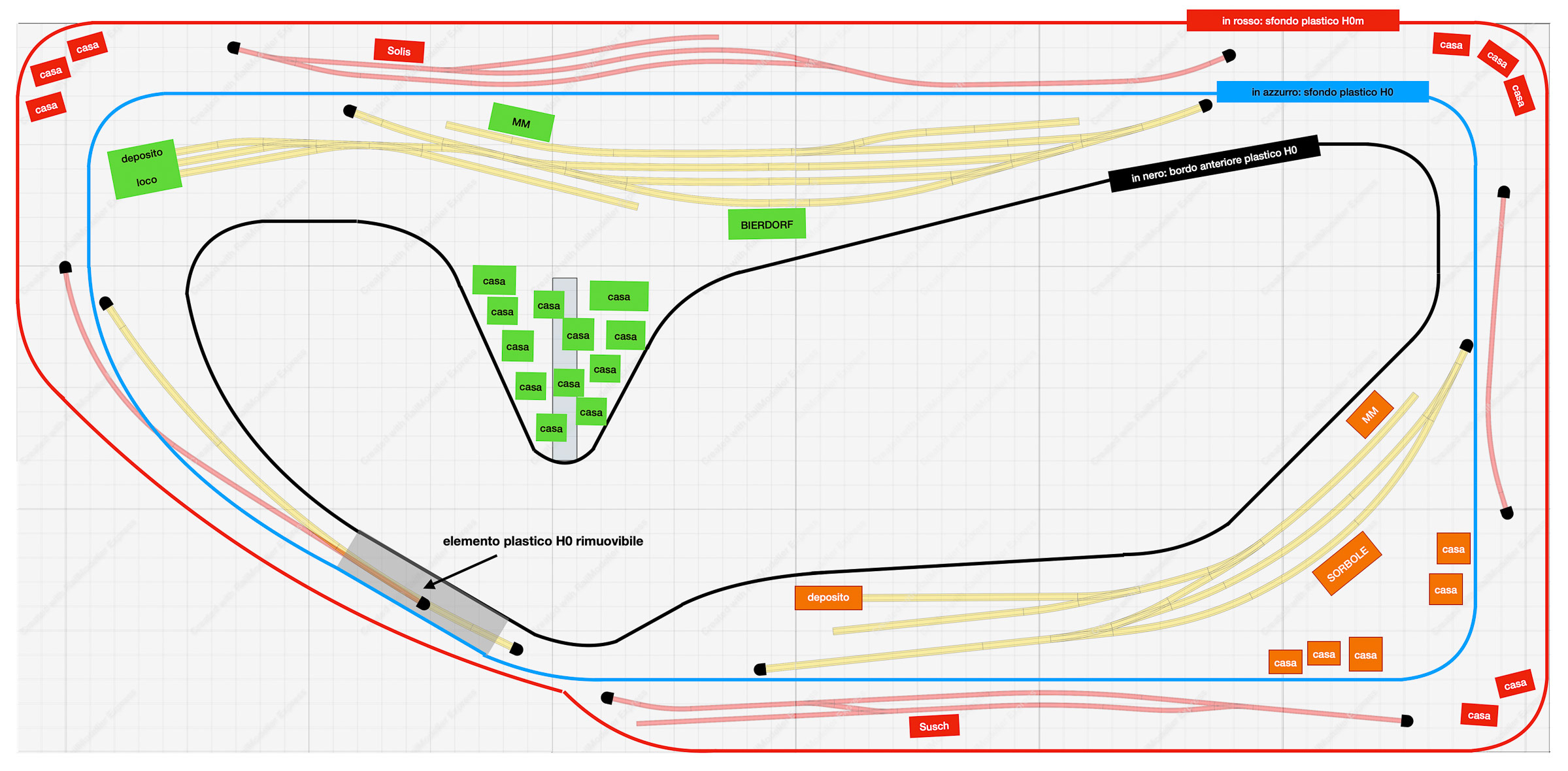 - in azzurro lo sfondo del plastico DB/FS (coincide con il bordo anteriore del plastico RhB tranne che per la linea da parata dove i due tracciati si sovrappongono in un tratto);