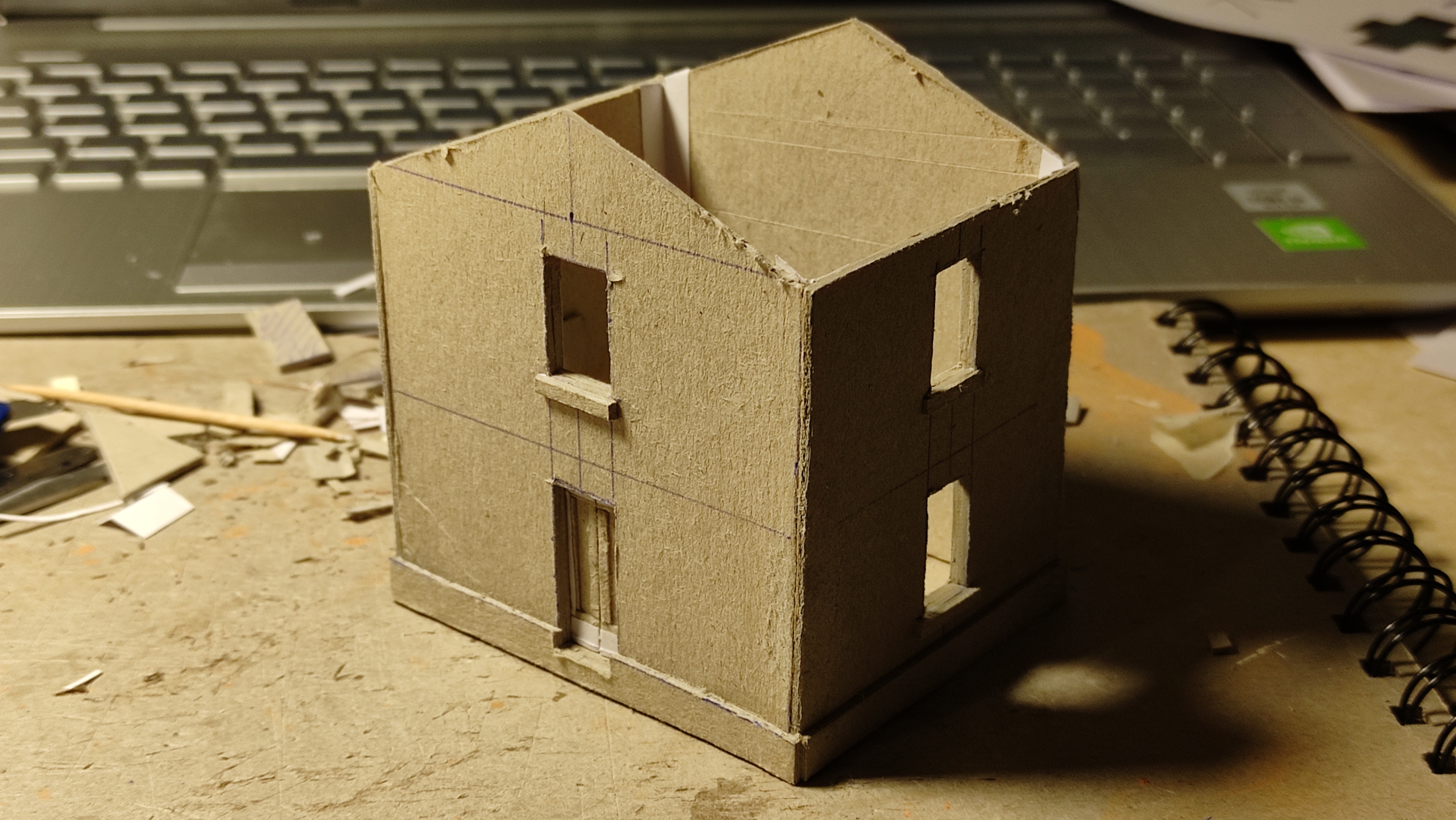 Nel frattempo, mente decido il da farsi, ho lasciato in sospeso la costruzione del tetto. Mi sono dedicato a provare a costruire un prototipo di finestra + scuri. Ho poi sostituito i davanzali con alcuni più sottili (considerate che andrà ancora tutto stuccato e andranno sistemate le fessure che si sono create con l'asciugatura dello stucco) e ho preparato la rampa davanti alla porta d'ingresso. Due foto: