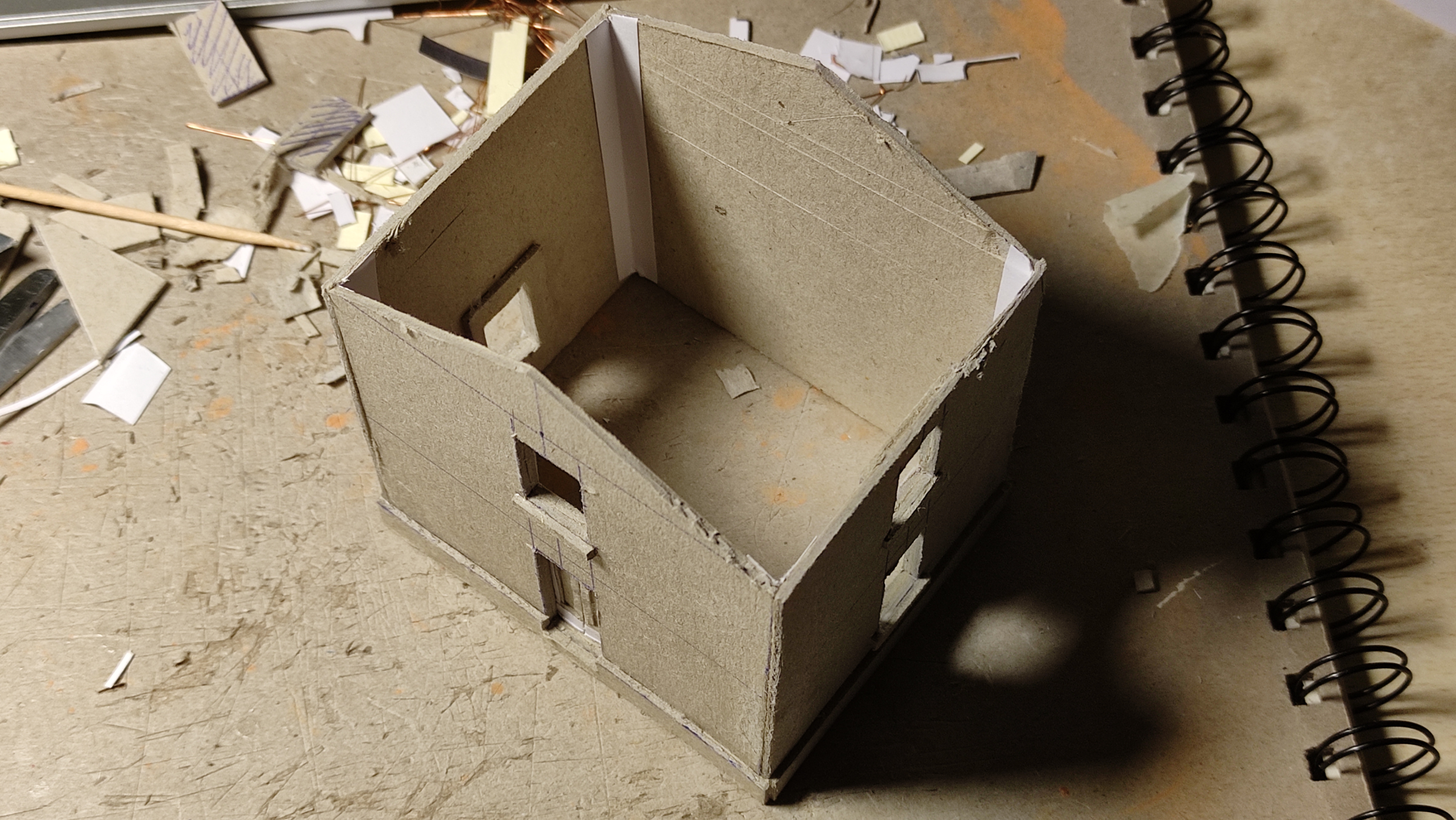 ...ennesimo aggiornamento notturno. Ho fatto un deciso passo in avanti con il casello. Innanzitutto ho ritagliato porta e finestre, poi ho incollato la striscia di basamento. Inoltre ho raddoppiato la profondità dei buchi degli infissi incollando dei pezzi di cartoncino. Qui vedete le quattro pareti smontate e poi incollate.