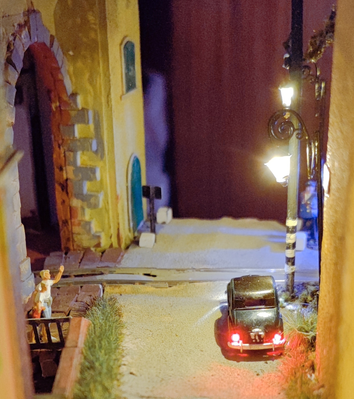 Molto carino, se posso permettermi, attenuerei un pochino la luminosità dei lampioni e soprattutto dei fari della Topolino (al vero era poco più di quella delle candele)